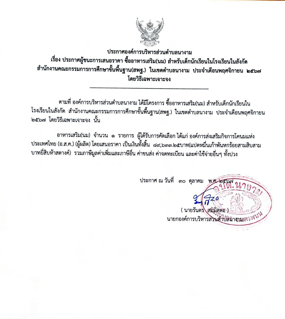 ชื่อเรื่อง : ประกาศผู้ชนะการเสนอราคา ซื้ออาหารเสริม(นม) สำหรับเด็กนักเรียนในโรงเรียนในสังกัด สำนักงานคณะกรรมการการศึกษาขั้นพื้นฐาน(สพฐ.) ในเขตตำบลนางาม ประจำเดือนพฤศจิกายน ๒๕๖๗ โดยวิธีเฉพาะเจาะจง