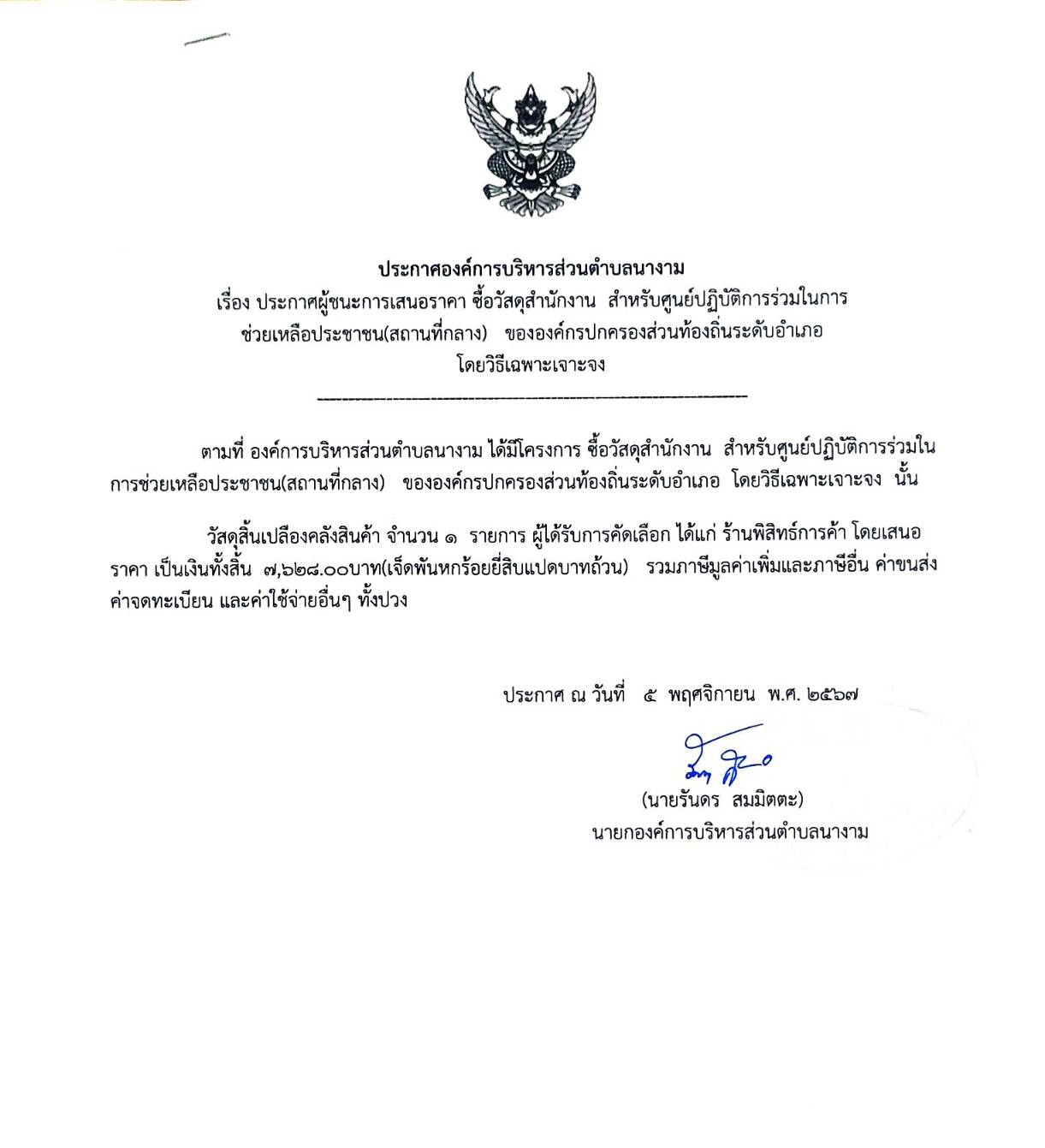 ประกาศผู้ชนะการเสนอราคา ซื้อวัสดุสำนักงาน สำหรับศูนย์ปฏิบัติการร่วมในการ ช่วยเหลือประชาชน(สถานที่กลาง) ขององค์กรปกครองส่วนท้องถิ่นระดับอำเภอ โดยวิธีเฉพาะเจาะจง