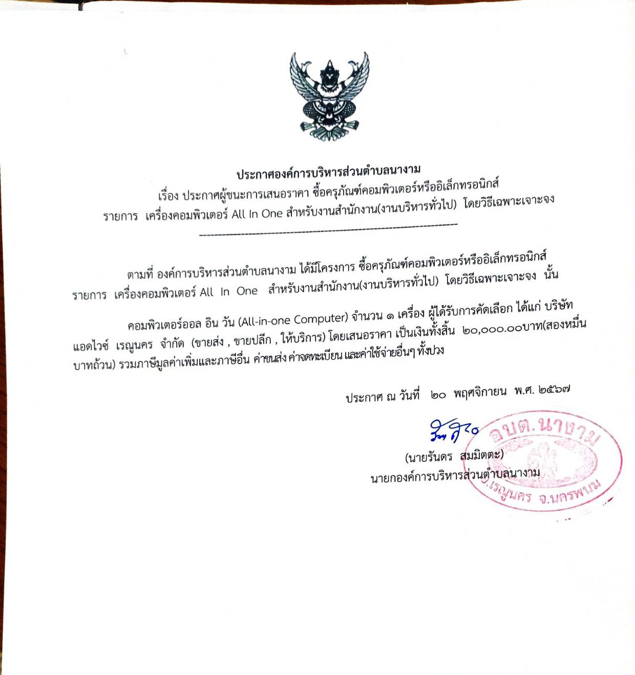 ประกาศผู้ชนะการเสนอราคา ซื้อครุภัณฑ์คอมพิวเตอร์หรืออิเล็กทรอนิกส์ รายการ เครื่องคอมพิวเตอร์ All In One สำหรับงานสำนักงาน(งานบริหารทั่วไป) โดยวิธีเฉพาะเจาะจง