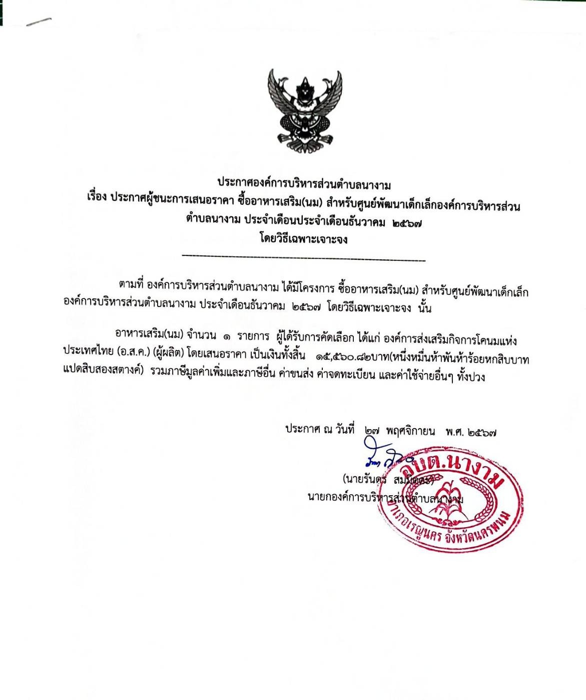 ประกาศผู้ชนะการเสนอราคา ซื้ออาหารเสริม(นม) สำหรับศูนย์พัฒนาเด็กเล็กองค์การบริหารส่วนตำบลนางาม ประจำเดือนธันวาคม ๒๕๖๗ โดยวิธีเฉพาะเจาะจง