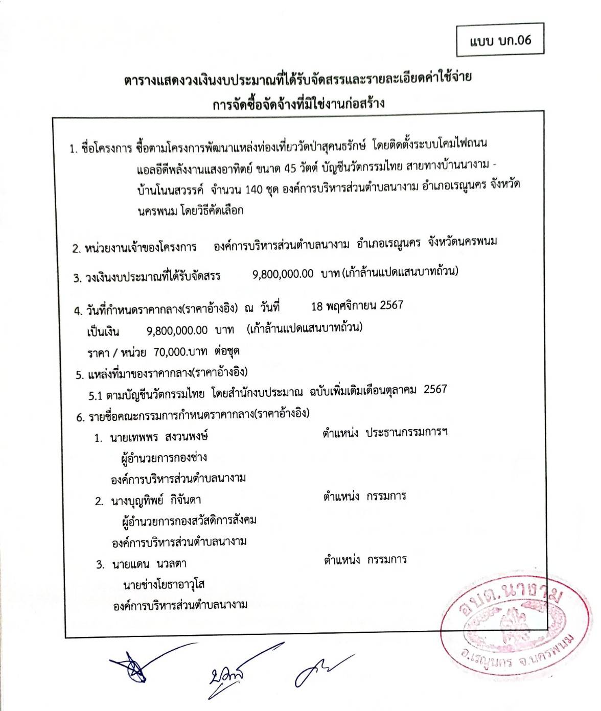 ชื่อเรื่อง : ประชาสัมพันธ์การเปิดเผยราคากลางซื้อตามโครงการพัฒนาแหล่งท่องเที่ยววัดป่าสุคนธรักษ์ โดยติดตั้งระบบโคมไฟถนนแอลอีดีพลังงานแสงอาทิตย์ ขนาด 45 วัตต์ บัญชีนวัตกรรมไทย สายทางบ้านนางาม - บ้านโนนสวรรค์ จำนวน 140 ชุด องค์การบริหารส่วนตำบลนางาม อำเภอเรณูนคร จังหวัดนครพนม โดยวิธีคัดเลือก