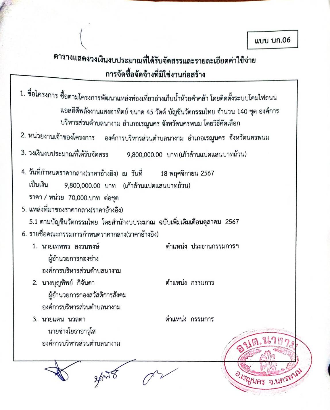 ชื่อเรื่อง : ประชาสัมพันธ์การเปิดเผยราคากลางซื้อตามโครงการพัฒนาแหล่งท่องเที่ยวอ่างเก็บน้ำห้วยคำคล้า โดยติดตั้งระบบโคมไฟถนนแอลอีดีพลังงานแสงอาทิตย์ ขนาด 45 วัตต์ บัญชีนวัตกรรมไทย จำนวน 140 ชุด องค์การบริหารส่วนตำบลนางาม อำเภอเรณูนคร จังหวัดนครพนม โดยวิธีคัดเลือก