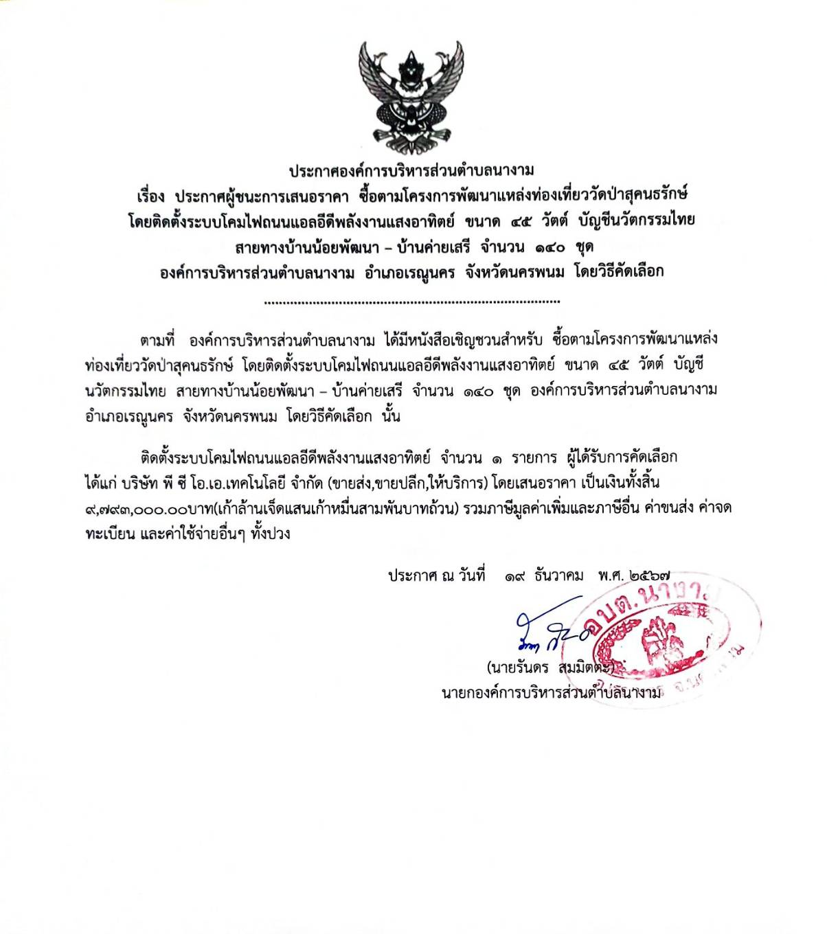 ชื่อเรื่อง : ประกาศผู้ชนะการเสนอราคา ซื้อตามโครงการพัฒนาแหล่งท่องเที่ยววัดป่าสุคนธรักษ์ โดยติดตั้งระบบโคมไฟถนนแอลอีดีพลังงานแสงอาทิตย์ ขนาด 45 วัตต์ บัญชีนวัตกรรมไทย สายทางบ้านน้อยพัฒนา - บ้านค่ายเสรี จำนวน 140 ชุด องค์การบริหารส่วนตำบลนางาม อำเภอเรณูนคร จังหวัดนครพนม โดยวิธีคัดเลือก