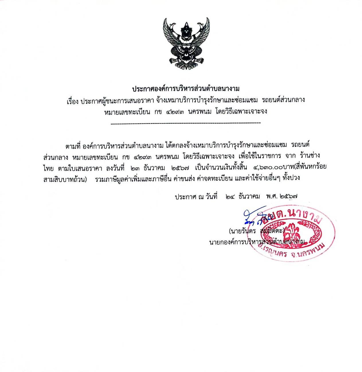 ประกาศผู้ชนะการเสนอราคา จ้างเหมาบริการบำรุงรักษาและซ่อมแซม รถยนต์ส่วนกลางหมายเลขทะเบียน กข ๔๒๙๓ นครพนม โดยวิธีเฉพาะเจาะจง