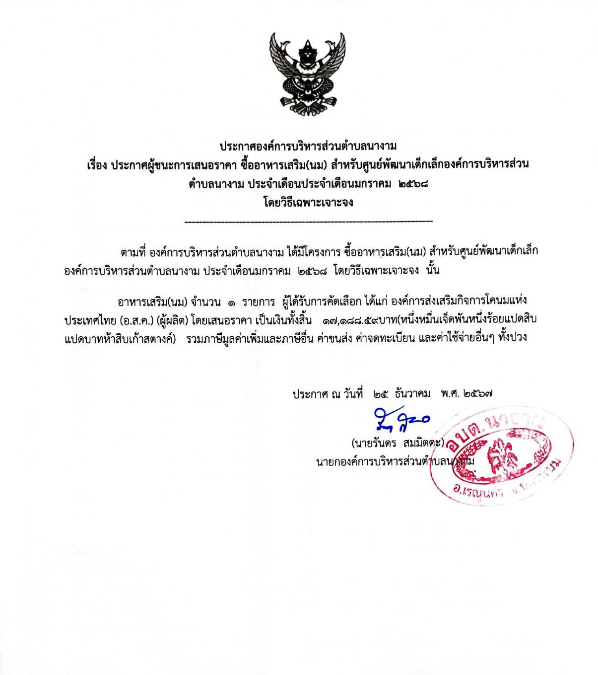 ประกาศผู้ชนะการเสนอราคา ซื้ออาหารเสริม(นม) สำหรับศูนย์พัฒนาเด็กเล็กองค์การบริหารส่วนตำบลนางาม ประจำเดือนมกราคม ๒๕๖๘ โดยวิธีเฉพาะเจาะจง