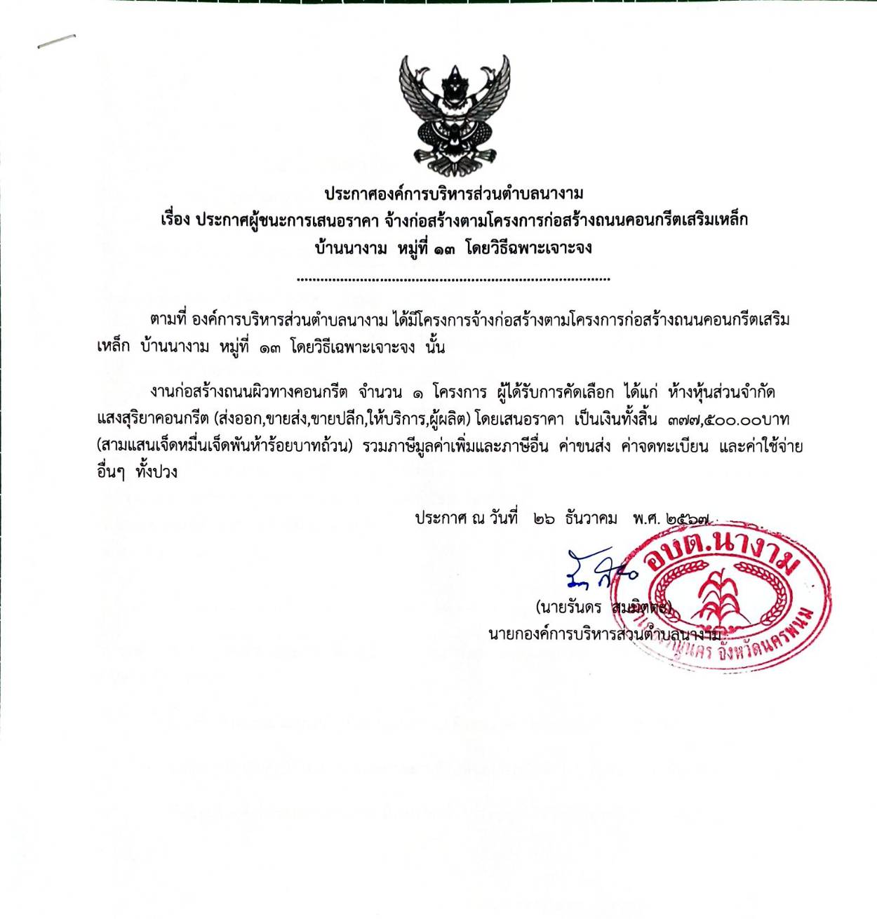 ประกาศผู้ชนะการเสนอราคา จ้างก่อสร้างตามโครงการก่อสร้างถนนคอนกรีตเสริมเหล็ก บ้านนางาม หมู่ที่ ๑๓ โดยวิธีเฉพาะเจาะจง