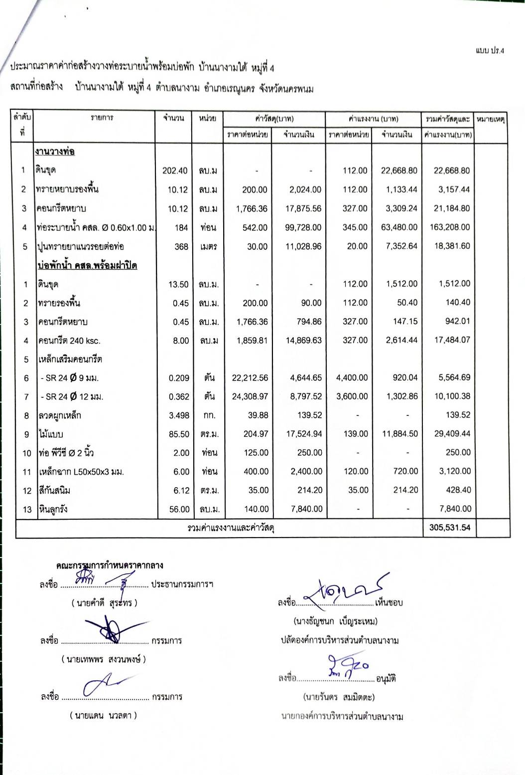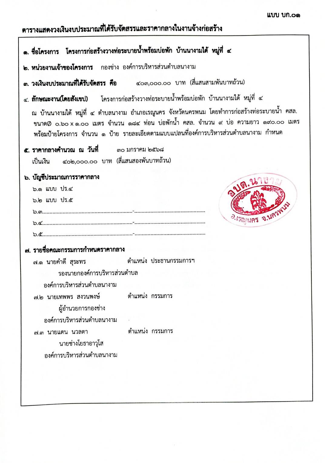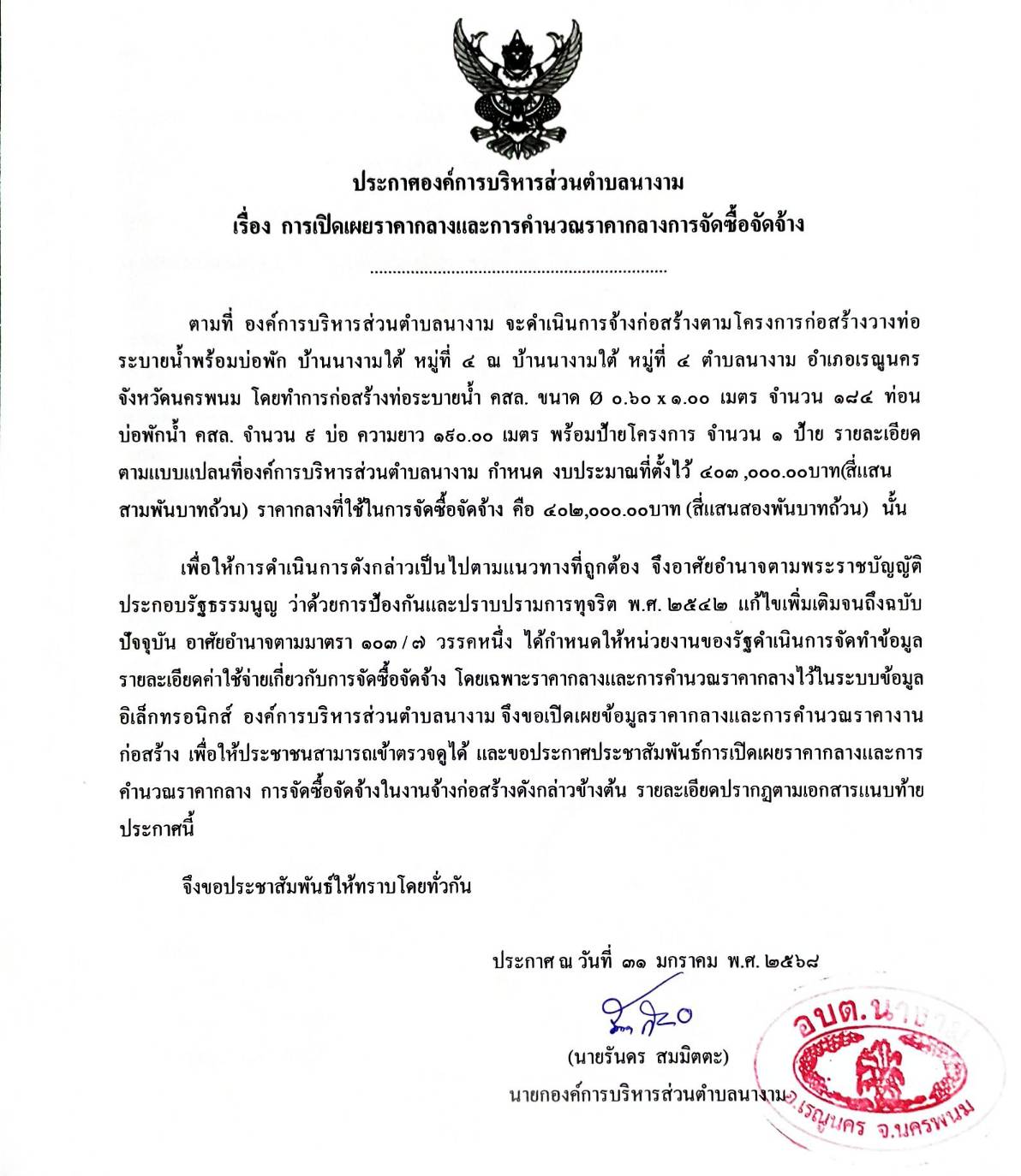 ประชาสัมพันธ์การเปิดเผยราคากลางจ้างตามโครงการก่อสร้างวางท่อระบายน้ำพร้อมบ่อพัก บ้านนางามใต้ หมู่ที่ ๔ โดยวิธีเฉพาะเจาะจง