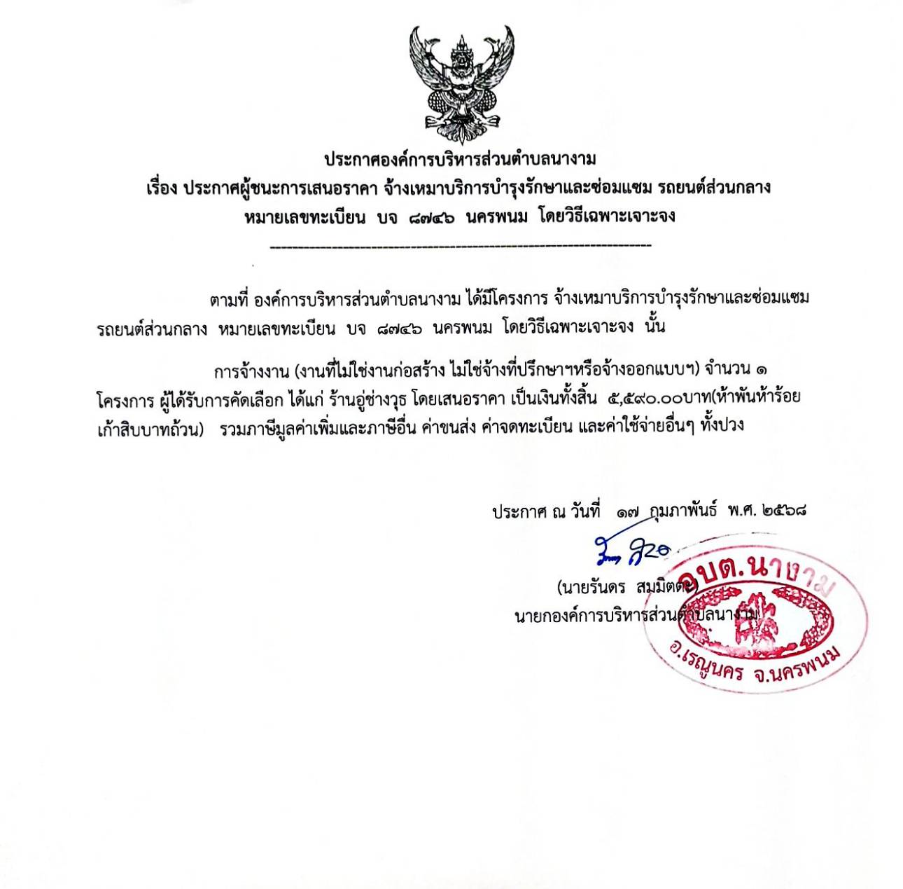 ประกาศผู้ชนะการเสนอราคา จ้างเหมาบริการบำรุงรักษาและซ่อมแซม รถยนต์ส่วนกลาง หมายเลขทะเบียน บจ ๘๗๔๖ นครพนม โดยวิธีเฉพาะเจาะจง