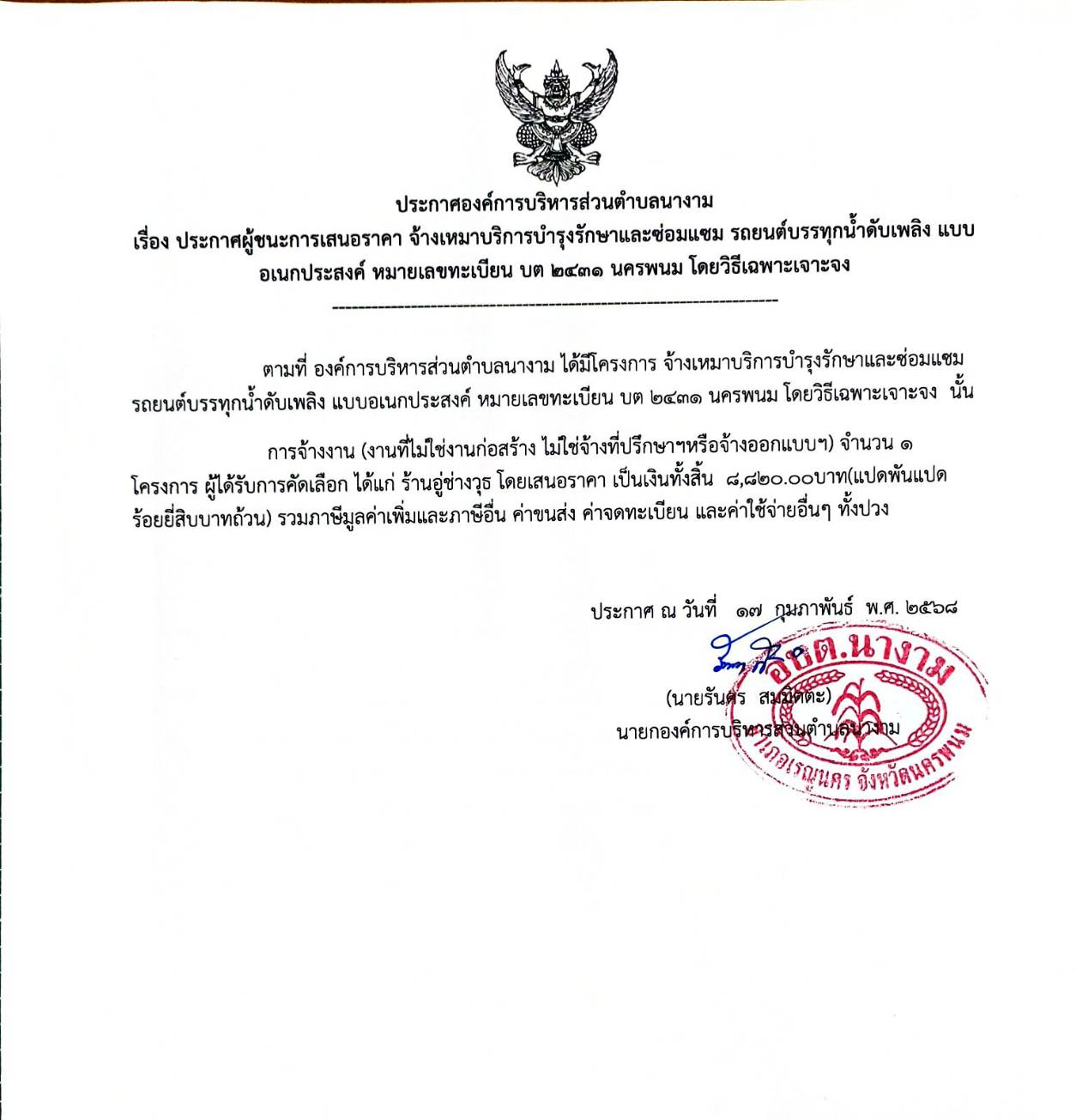 ประกาศผู้ชนะการเสนอราคา จ้างเหมาบริการบำรุงรักษาและซ่อมแซม รถยนต์บรรทุกน้ำดับเพลิง แบบอเนกประสงค์ หมายเลขทะเบียน บต ๒๔๓๑ นครพนม โดยวิธีเฉพาะเจาะจง