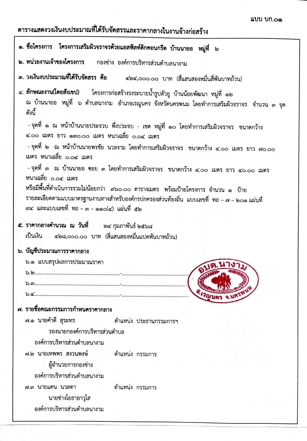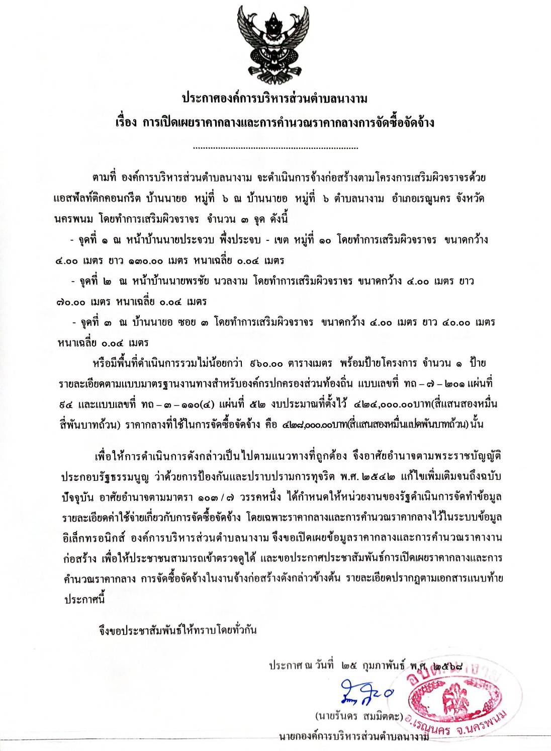 ประชาสัมพันธ์การเปิดเผยราคากลางจ้างตามโครงการเสริมผิวจราจรด้วยแอสฟัลท์ติกคอนกรีต บ้านนายอ หมู่ที่ ๖ โดยวิธีเฉพาะเจาะจง