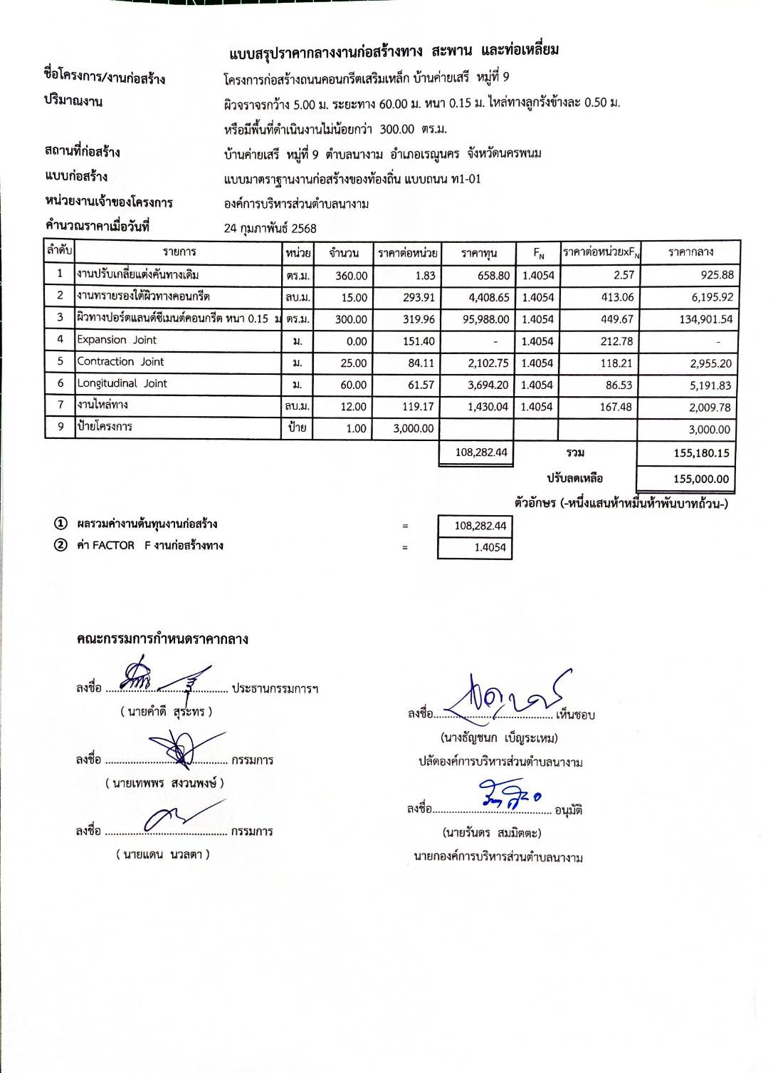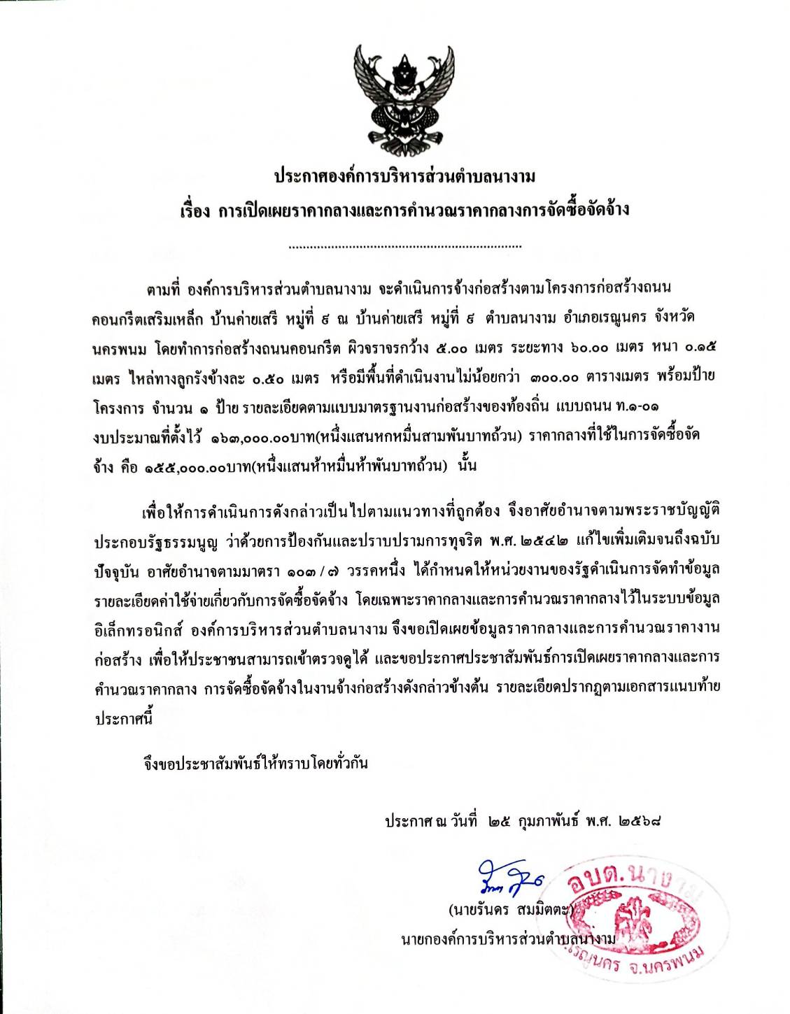 ประชาสัมพันธ์การเปิดเผยราคากลางจ้างตามโครงการก่อสร้างถนนคอนกรีตเสริมเหล็ก บ้านค่ายเสรี หมู่ที่ ๙ โดยวิธีเฉพาะเจาะจง