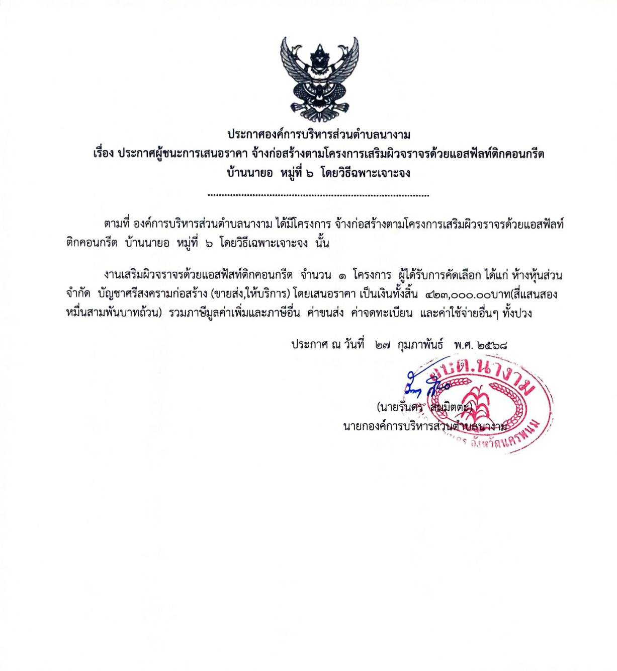 ประกาศผู้ชนะการเสนอราคา จ้างก่อสร้างตามโครงการเสริมผิวจราจรด้วยแอสฟัลท์ติกคอนกรีต บ้านนายอ หมู่ที่ ๖ โดยวิธีเฉพาะเจาะจง