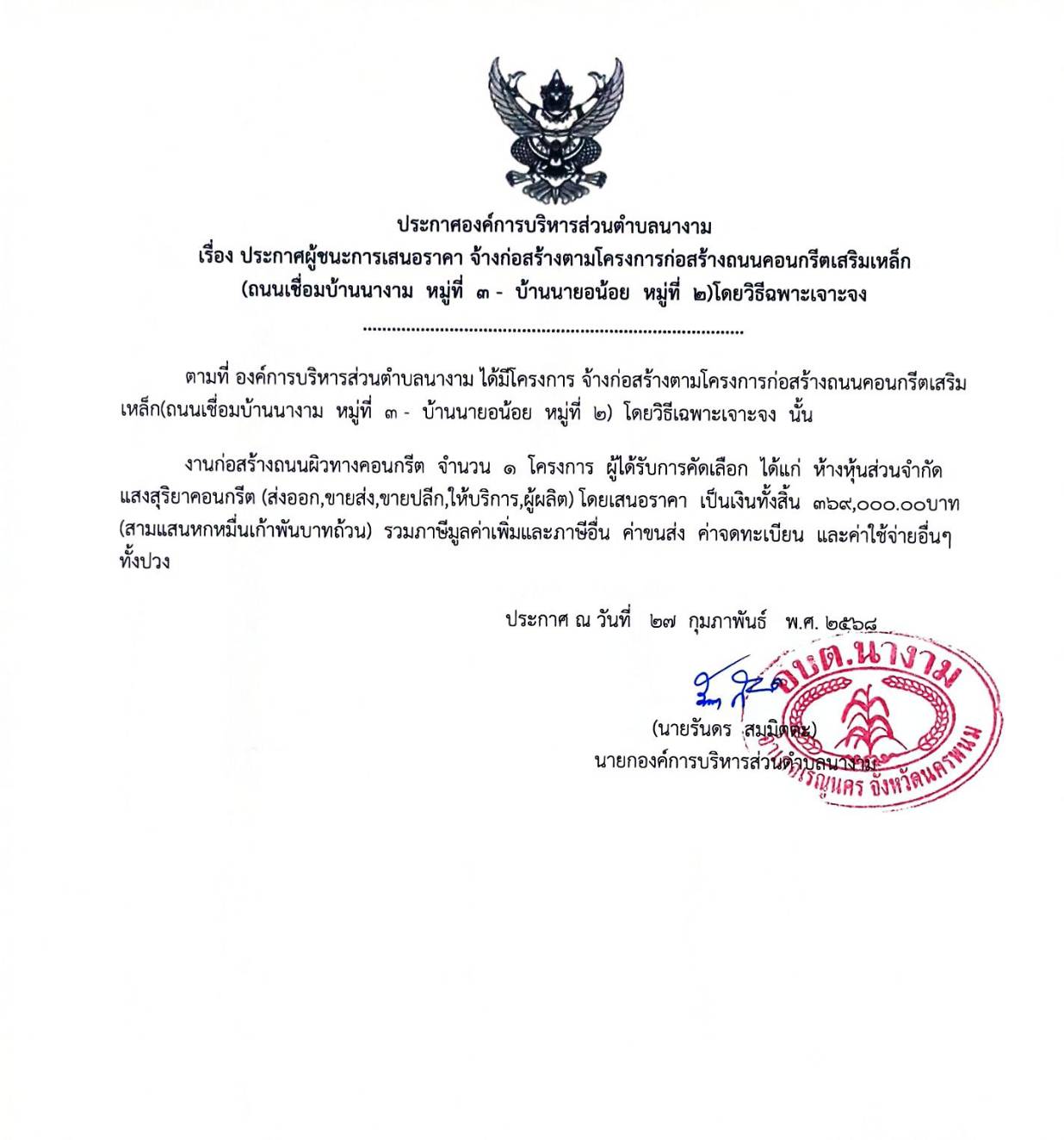 ประกาศผู้ชนะการเสนอราคา จ้างก่อสร้างตามโครงการก่อสร้างถนนคอนกรีตเสริมเหล็ก(ถนนเชื่อมบ้านนางาม หมู่ที่ ๓ - บ้านนายอน้อย หมู่ที่ ๒) โดยวิธีเฉพาะเจาะจง