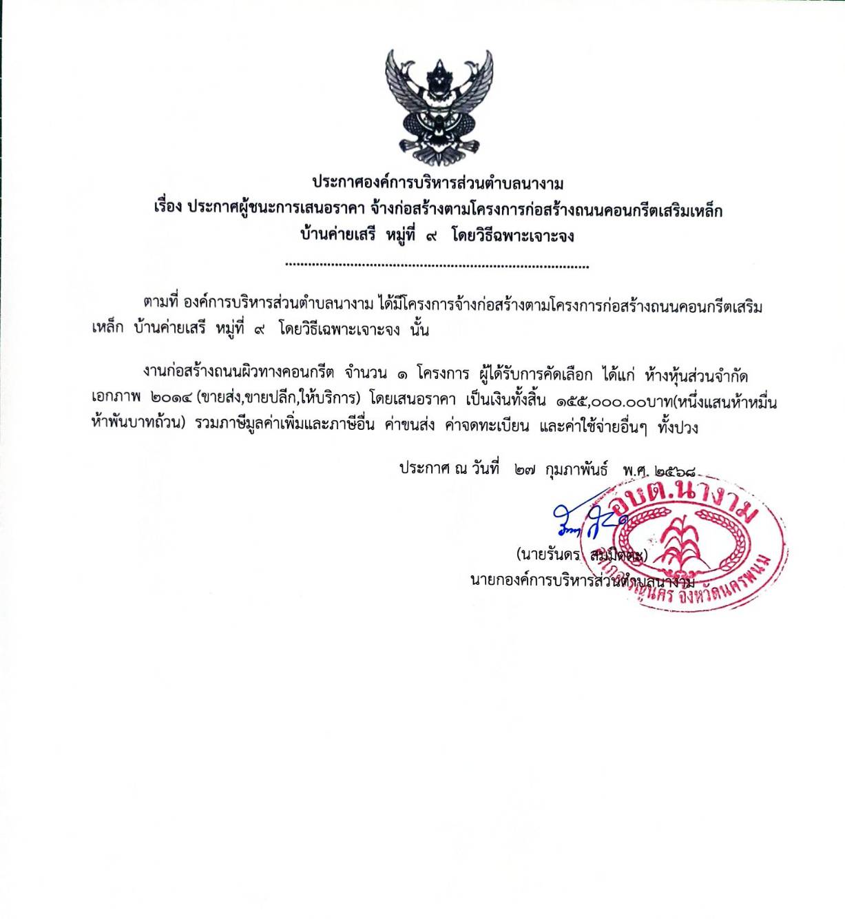 ประกาศผู้ชนะการเสนอราคา จ้างก่อสร้างตามโครงการก่อสร้างถนนคอนกรีตเสริมเหล็ก บ้านค่ายเสรี หมู่ที่ ๙ โดยวิธีเฉพาะเจาะจง