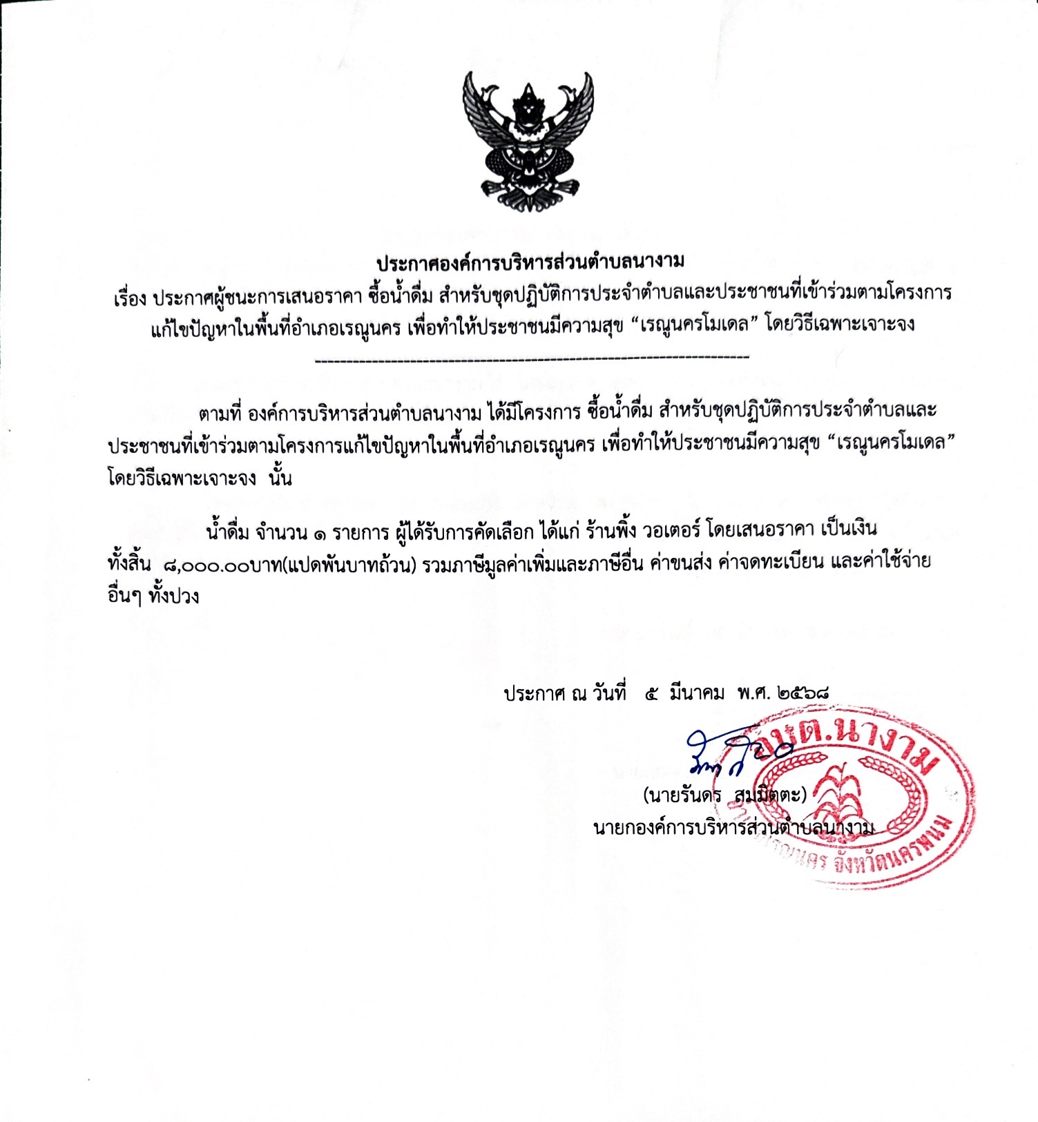 ชื่อเรื่อง : ประกาศผู้ชนะการเสนอราคา ซื้อน้ำดื่ม สำหรับชุดปฏิบัติการประจำตำบลและประชาชนที่เข้าร่วมตามโครงการแก้ไขปัญหาในพื้นที่อำเภอเรณูนคร เพื่อทำให้ประชาชนมีความสุข เรณูนครโมเดล โดยวิธีเฉพาะเจาะจง