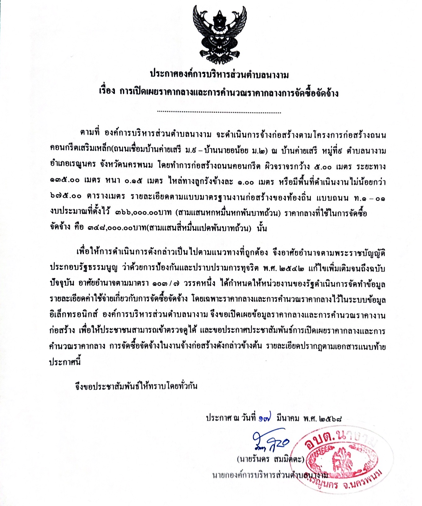 ประชาสัมพันธ์การเปิดเผยราคากลางจ้างตามโครงการก่อสร้างถนนคอนกรีตเสริมเหล็ก(ถนนเชื่อมบ้านค่ายเสรี หมู่ที่ 9 - บ้านนายอน้อย หมู่ที่ 2) โดยวิธีเฉพาะเจาะจง
