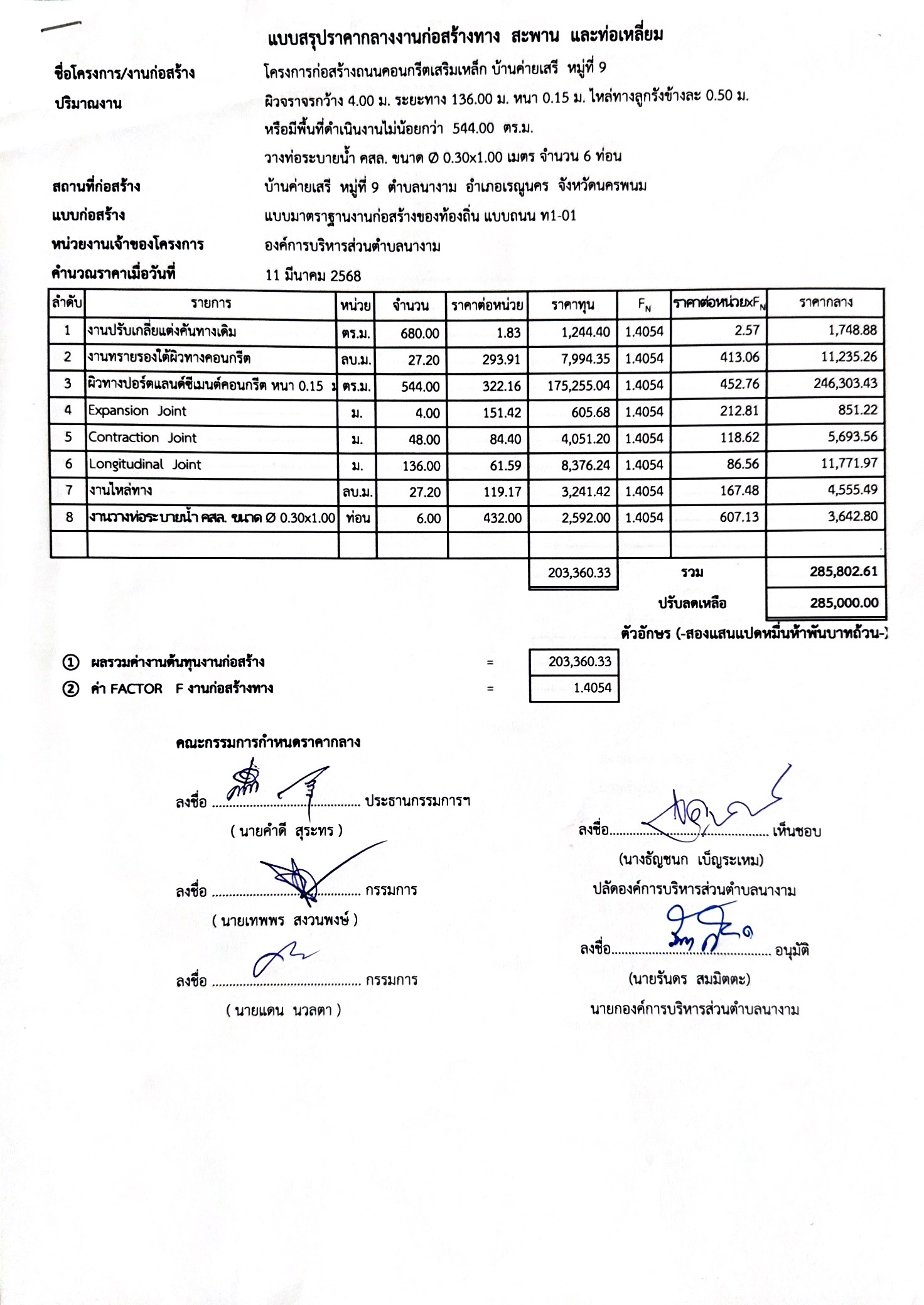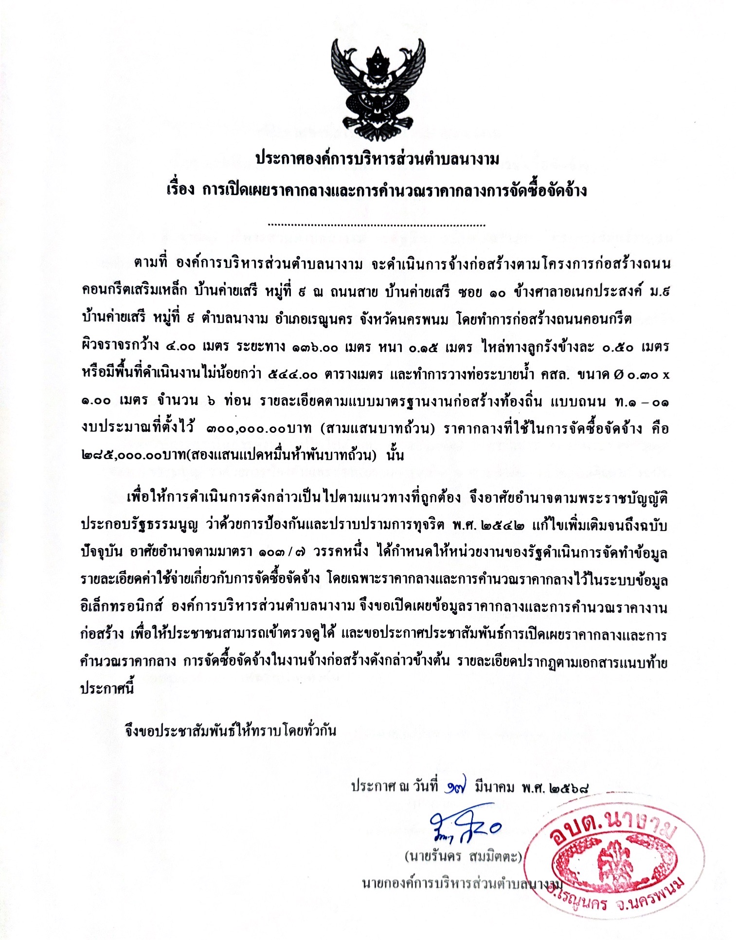 ชื่อเรื่อง : ประชาสัมพันธ์การเปิดเผยราคากลางจ้างตามโครงการก่อสร้างถนนคอนกรีตเสริมเหล็ก บ้านค่ายเสรี หมู่ที่ 9 โดยวิธีเฉพาะเจาะจง