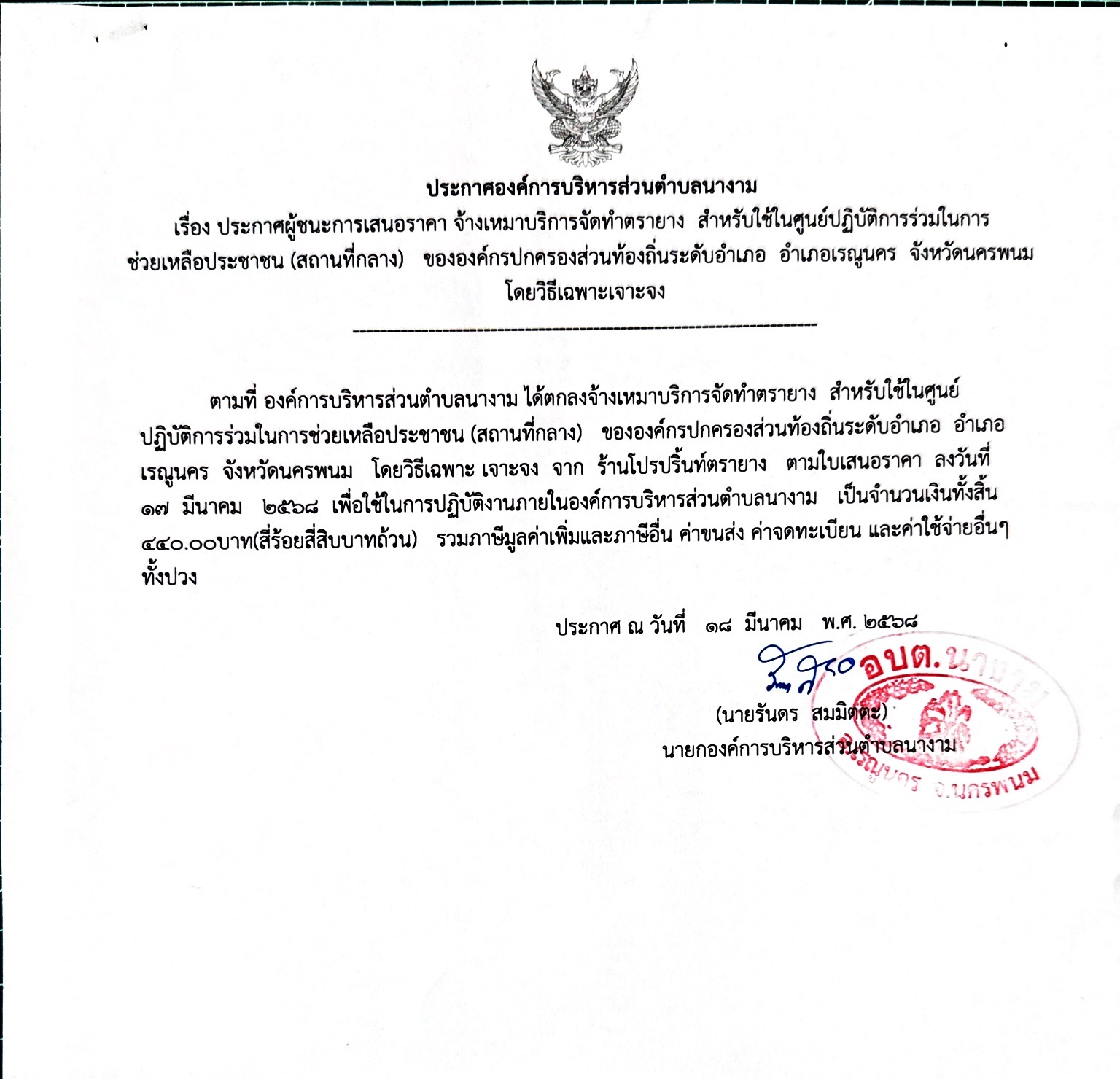 ชื่อเรื่อง : ประกาศผู้ชนะการเสนอราคา จ้างเหมาบริการจัดทำตรายาง สำหรับใช้ในศูนย์ปฏิบัติการร่วมในการช่วยเหลือประชาชน(สถานที่กลาง) ขององค์กรปกครองส่วนท้องถิ่นระดับอำเภอ อำเภอเรณูนคร จังหวัดนครพนม โดยวิธีเฉพาะเจาะจง