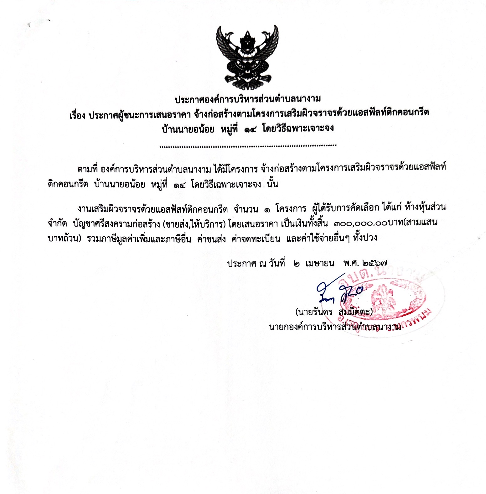 ประกาศผู้ชนะการเสนอราคา จ้างตามโครงการเสริมผิว จราจรด้วยแอสฟัลท์ติกคอนกรีต บ้านนายอน้อย หมู่ที่ 14 โดยวิธีเฉพาะเจาะจง