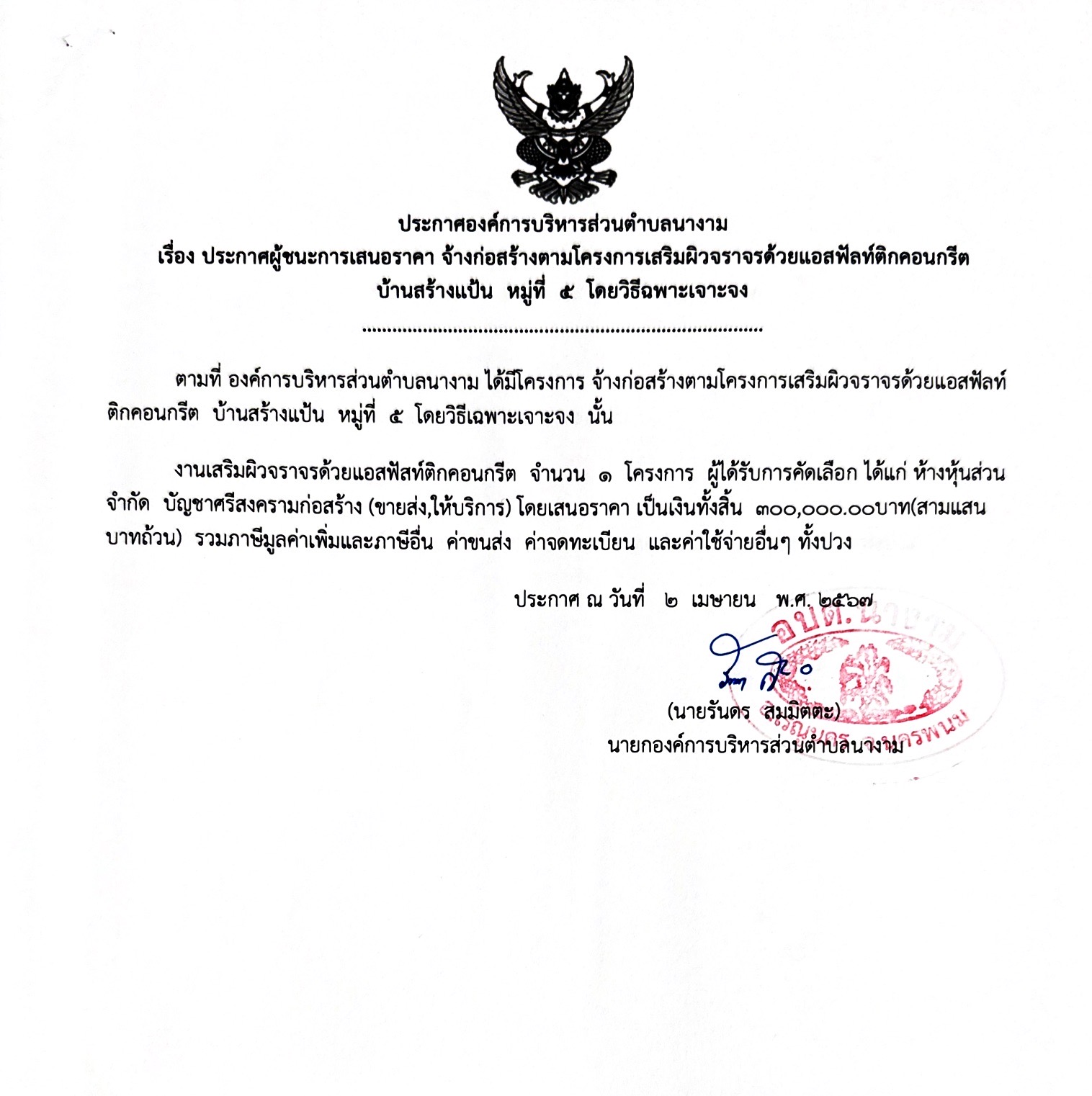 ประกาศผู้ชนะการเสนอราคา จ้างตามโครงการเสริมผิว จราจรด้วยแอสฟัลท์ติกคอนกรีต บ้านสร้างแป้น หมู่ที่ 5 โดยวิธีเฉพาะเจาะจง