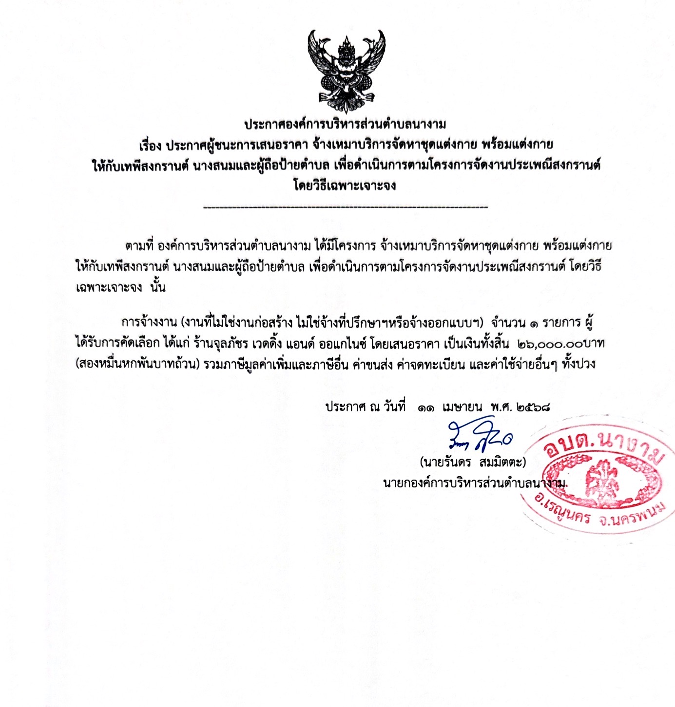 ชื่อเรื่อง : ประกาศผู้ชนะการเสนอราคา จ้างเหมาบริการจัดหาชุดแต่งกาย พร้อมแต่งกายให้กับเทพีสงกรานต์ นางสนมและผู้ถือป้ายตำบล เพื่อดำเนินการตามโครงการจัดงานประเพณีสงกรานต์ โดยวิธีเฉพาะเจาะจง