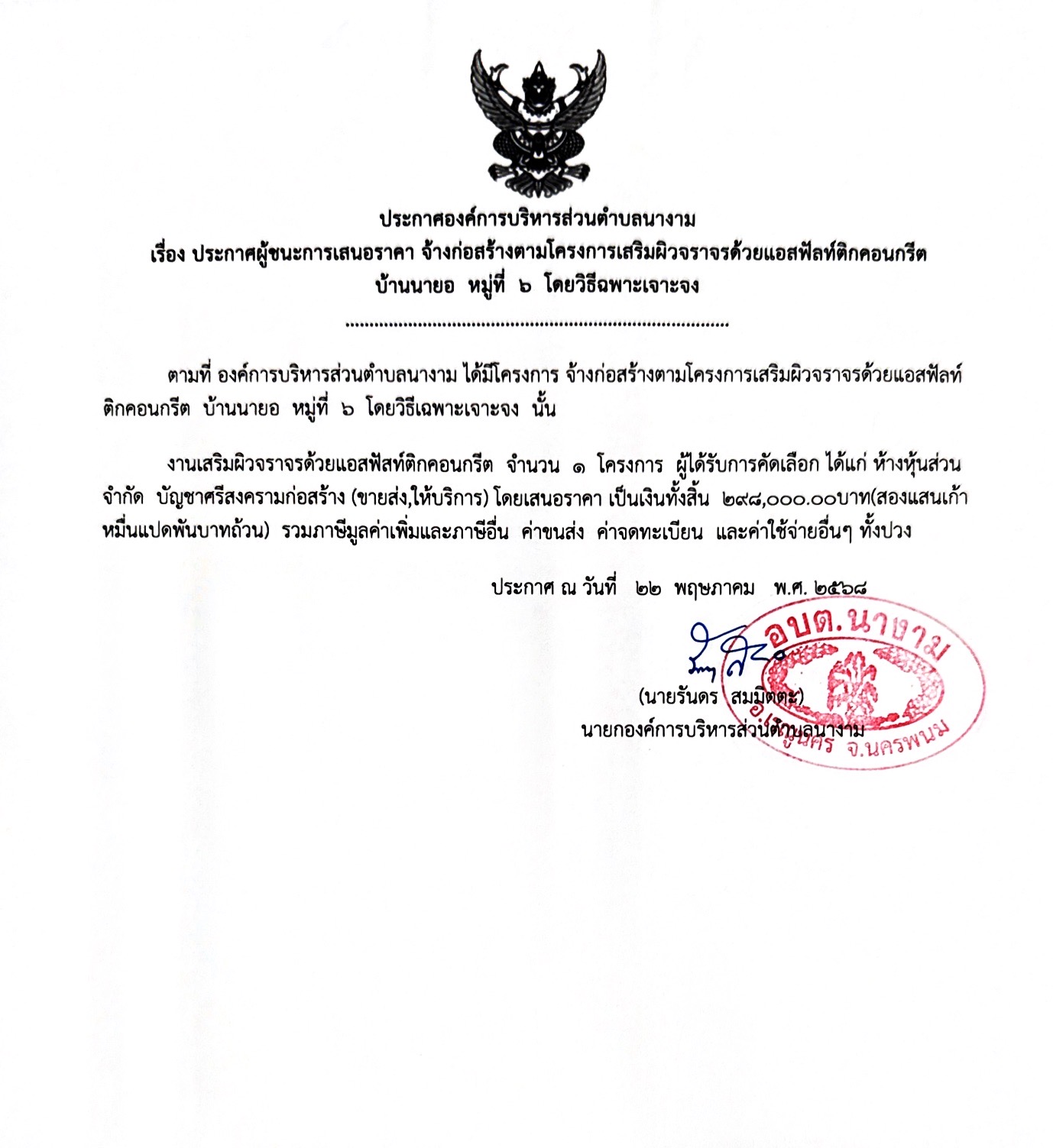 ประกาศผู้ชนะการเสนอราคา จ้างตามโครงการเสริมผิวจราจรด้วยแอสฟัลท์ติกคอนกรีต บ้านนายอ หมู่ที่ ๖ โดยวิธีเฉพาะเจาะจง