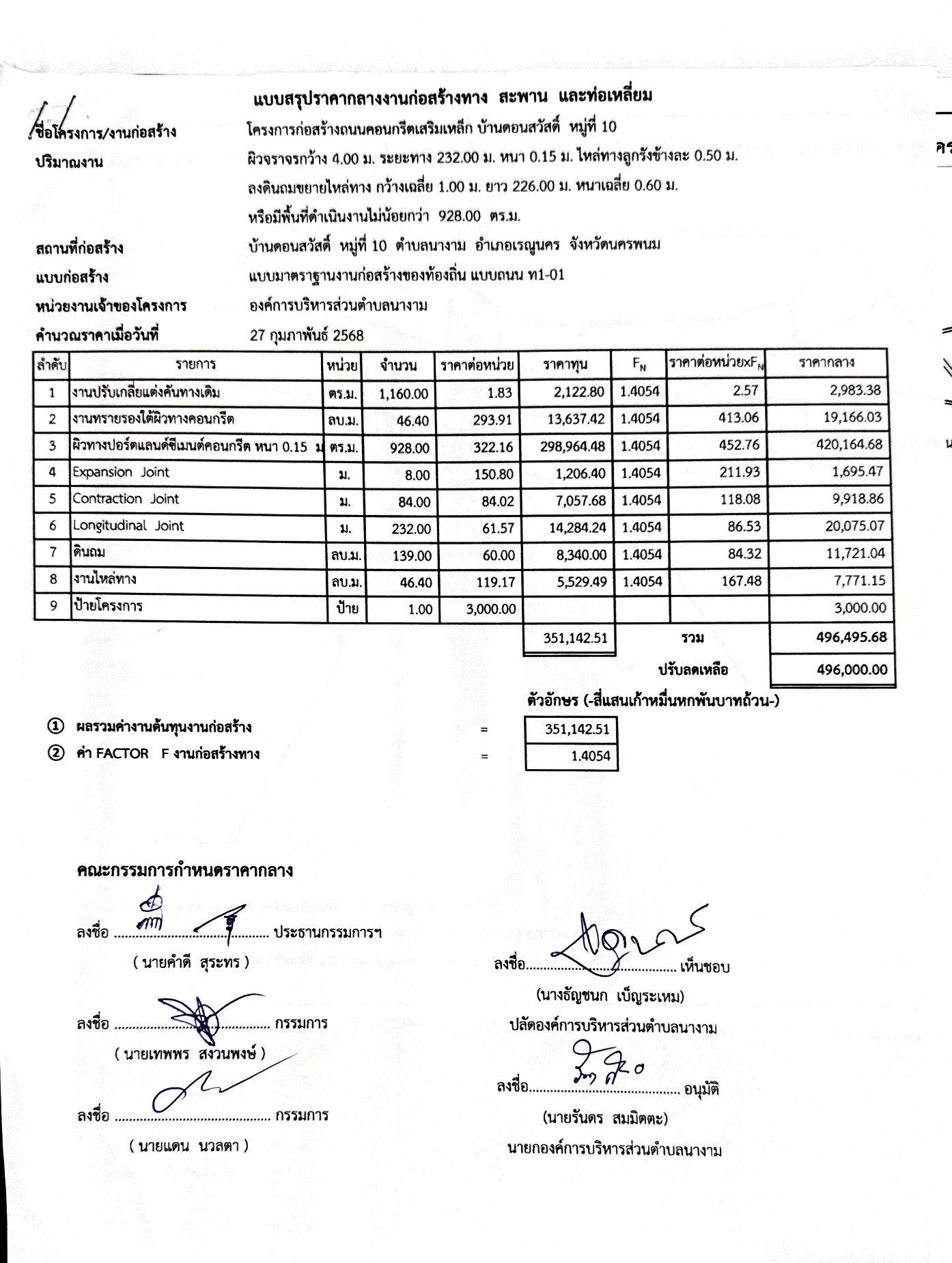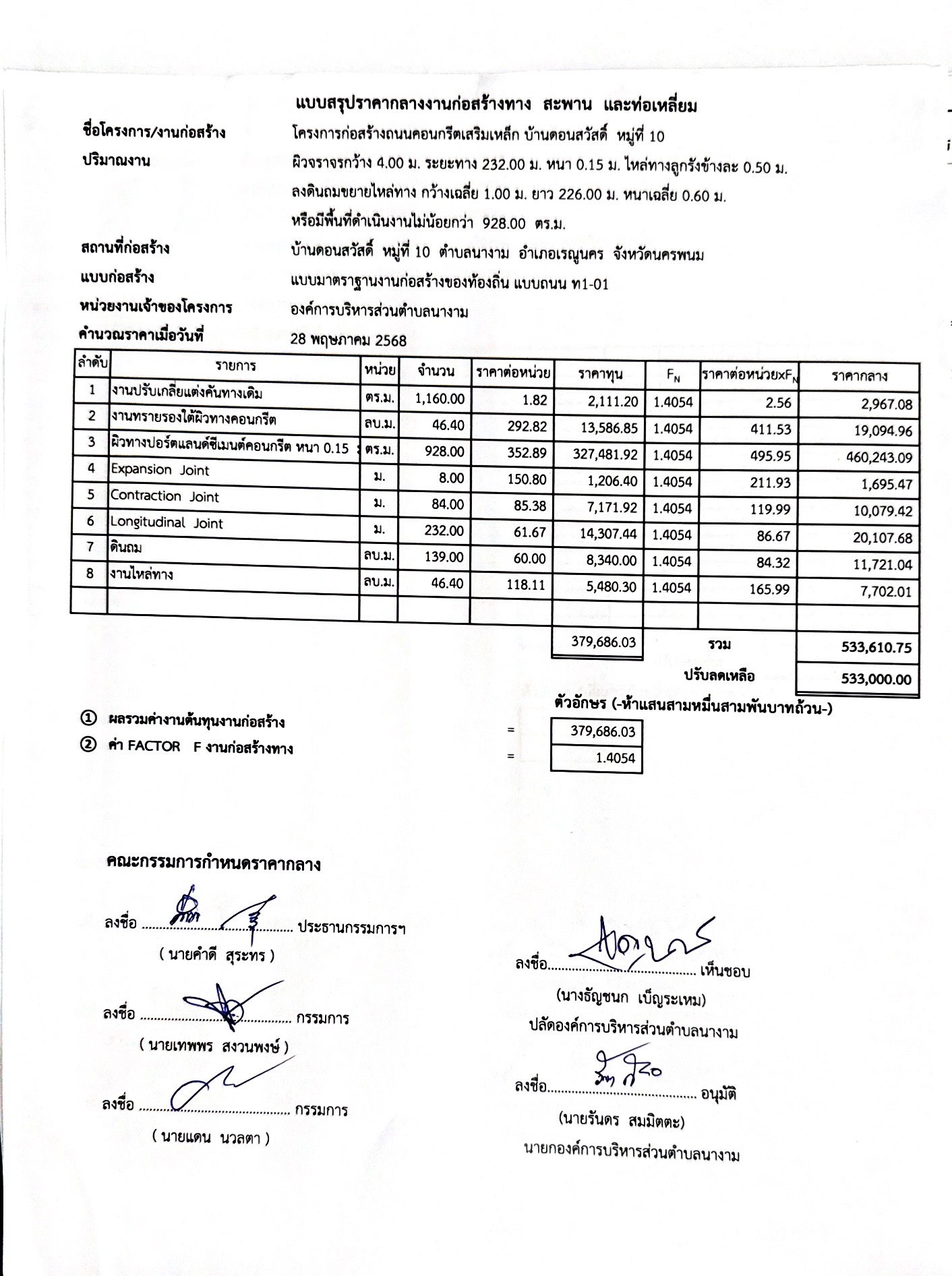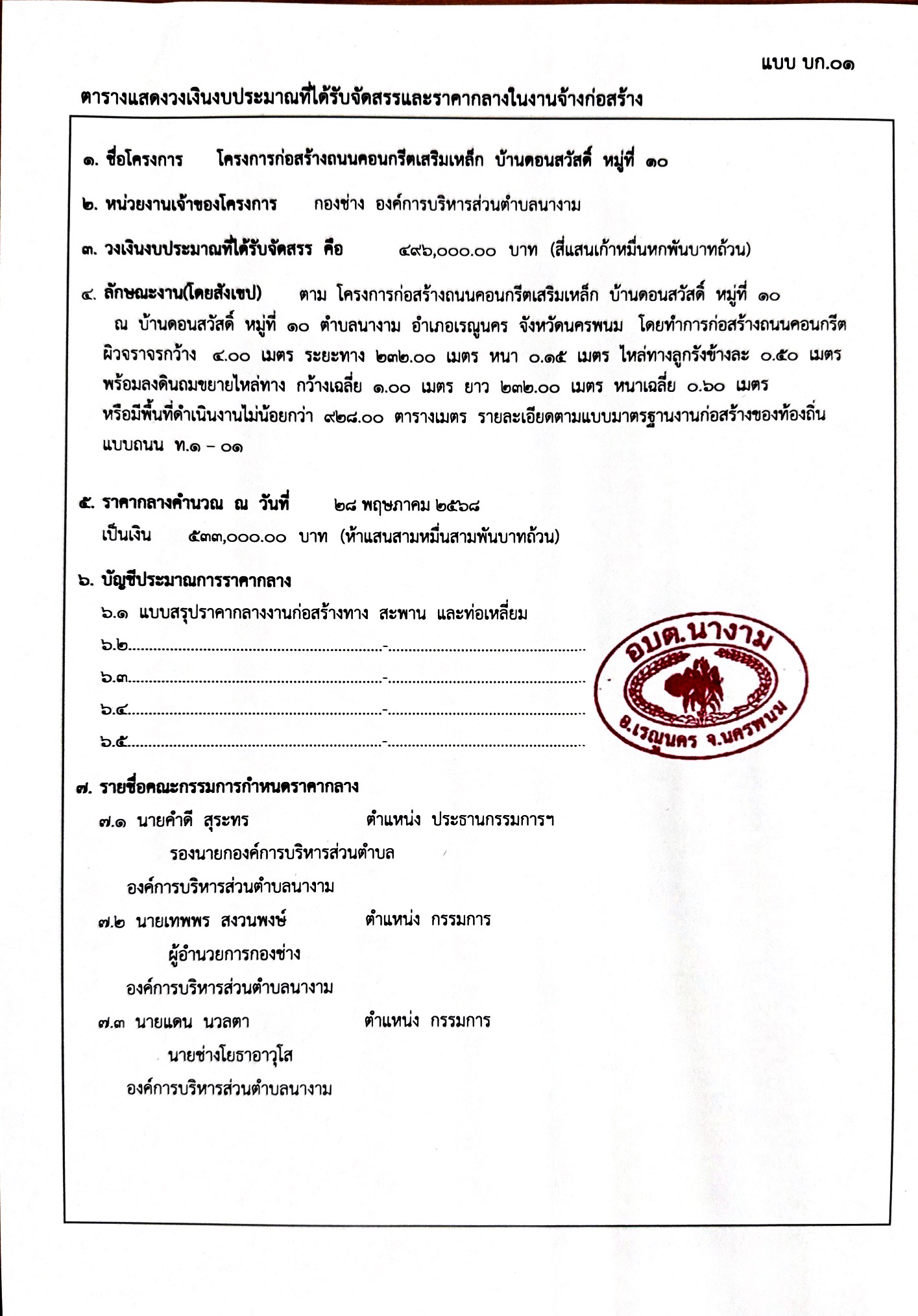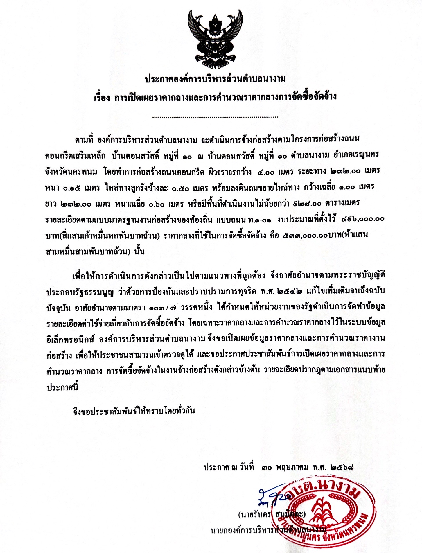 ประชาสัมพันธ์การเปิดเผยราคากลาง จ้างตามโครงการก่อสร้างถนนคอนกรีตเสริมเหล็ก บ้านดอนสวัสดิ์ หมู่ที่ ๑๐