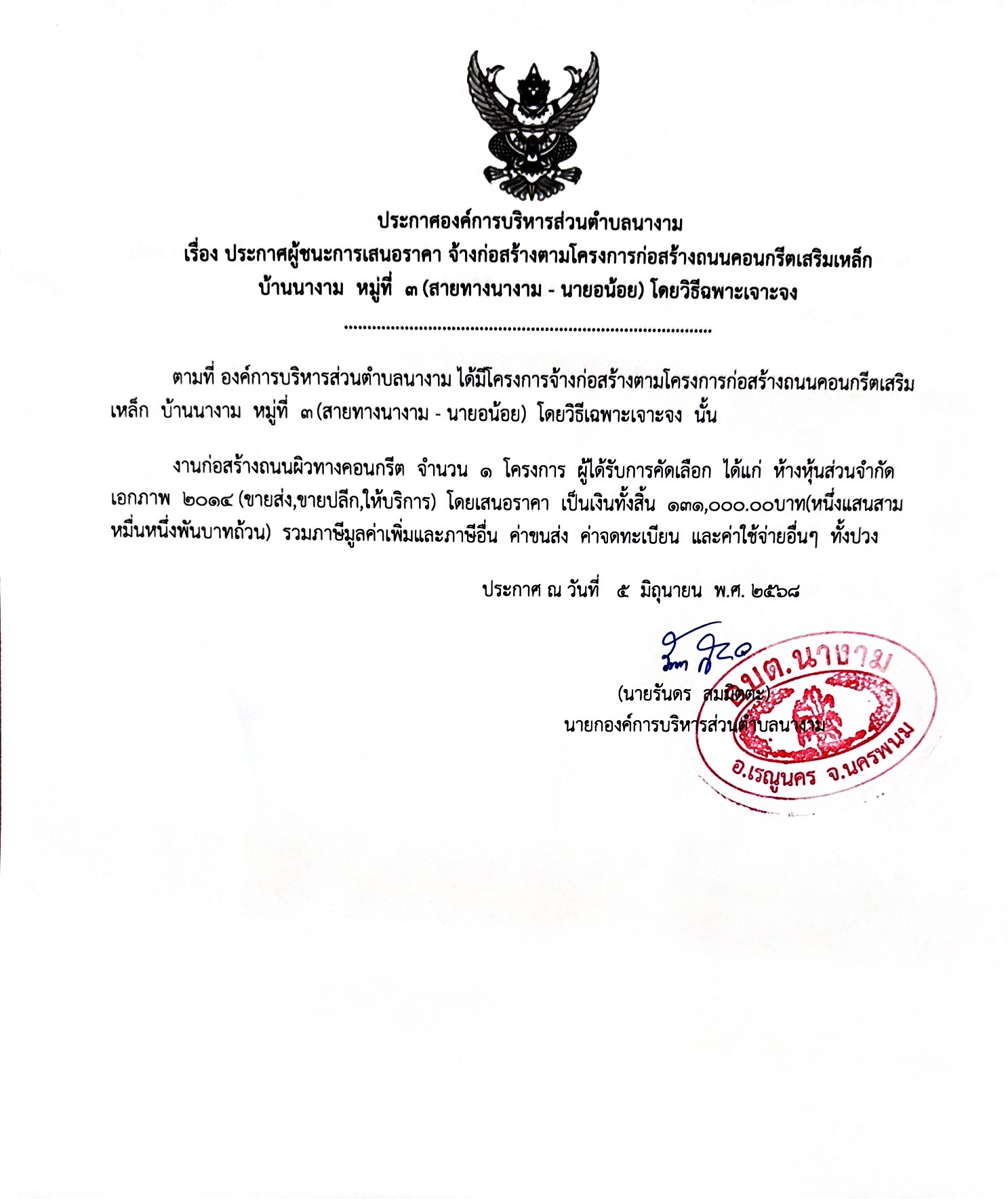 ประกาศผู้ชนะการเสนอราคา จ้างตามโครงการก่อสร้างถนนคอนกรีตเสริมเหล็ก บ้านนางาม หมู่ที่ 3(สายทางนางาม - นายอน้อย) โดยวิธีเฉพาะเจาะจง