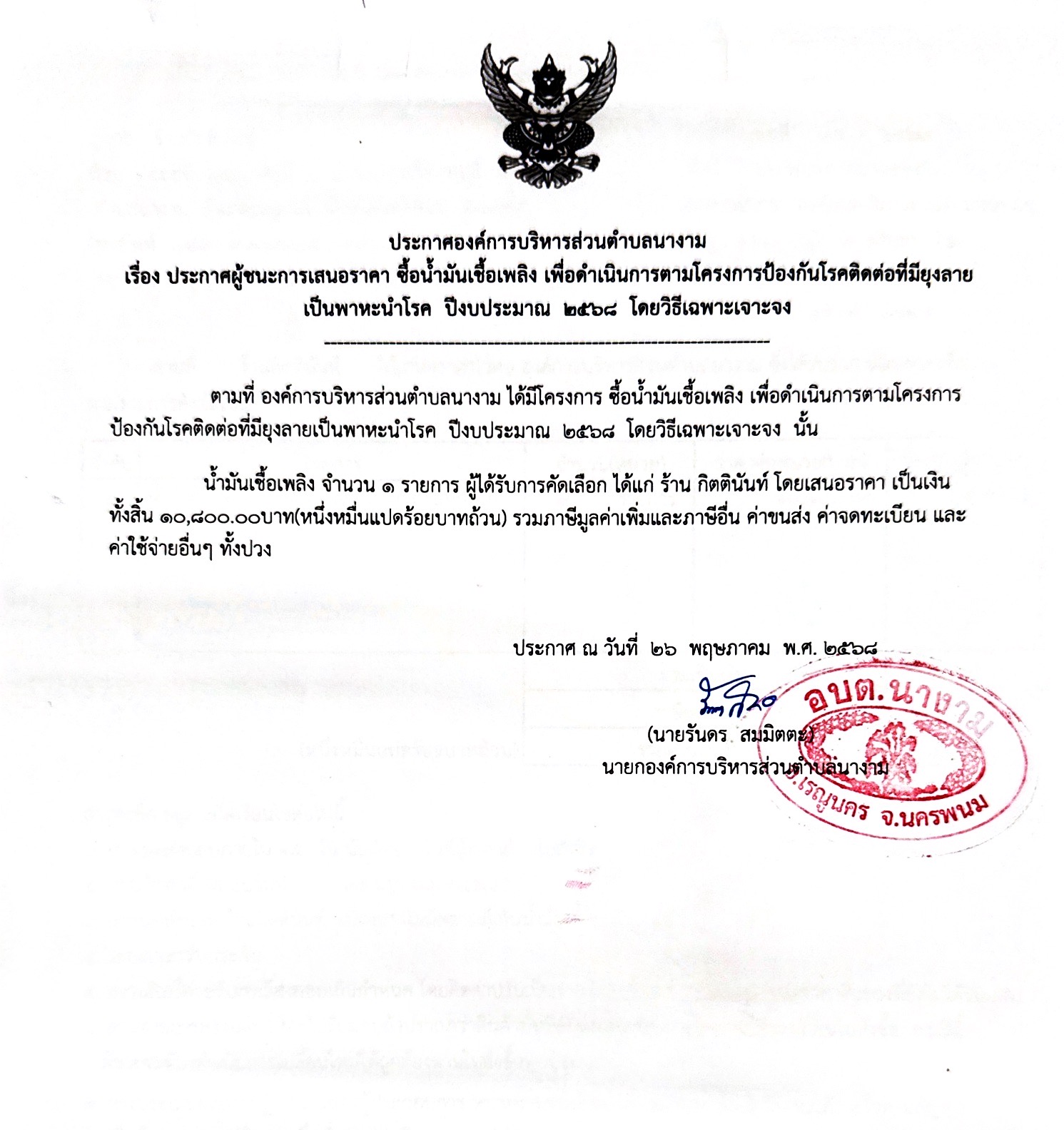 ประกาศผู้ชนะการเสนอราคา ซื้อน้ำมันเชื้อเพลิง เพื่อดำเนินการตามโครงการป้องกันโรคติดต่อที่มียุงลายเป็นพาหะนำโรค ปีงบประมาณ 2568 โดยวิธีเฉพาะเจาะจง