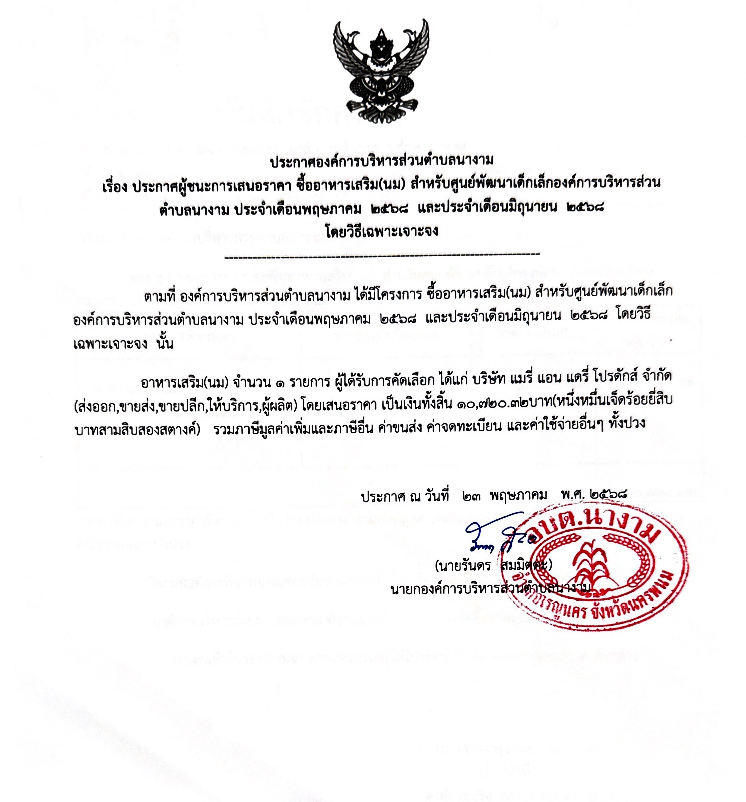 ชื่อเรื่อง : ประกาศผู้ชนะการเสนอราคา ซื้ออาหารเสริม(นม) สำหรับศูนย์พัฒนาเด็กเล็กองค์การบริหารส่วนตำบลนางาม ประจำเดือนพฤษภาคม ๒๕๖๘ และประจำเดือนมิถุนายน ๒๕๖๘ โดยวิธีเฉพาะเจาะจง