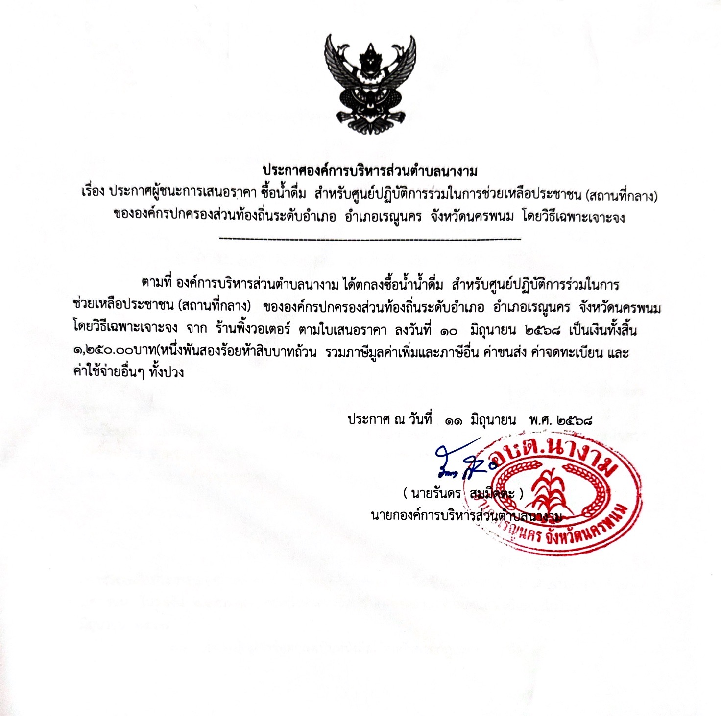 ชื่อเรื่อง : ประกาศผู้ชนะการเสนอราคา ซื้อน้ำดื่ม สำหรับศูนย์ปฏิบัติการร่วมในการช่วยเหลือประชาชน(สถานที่กลาง) ขององค์กรปกครองส่วนท้องถิ่นระดับอำเภอ อำเภอเรณูนคร จังหวัดนครพนม โดยวิธีเฉพาะเจาะจง