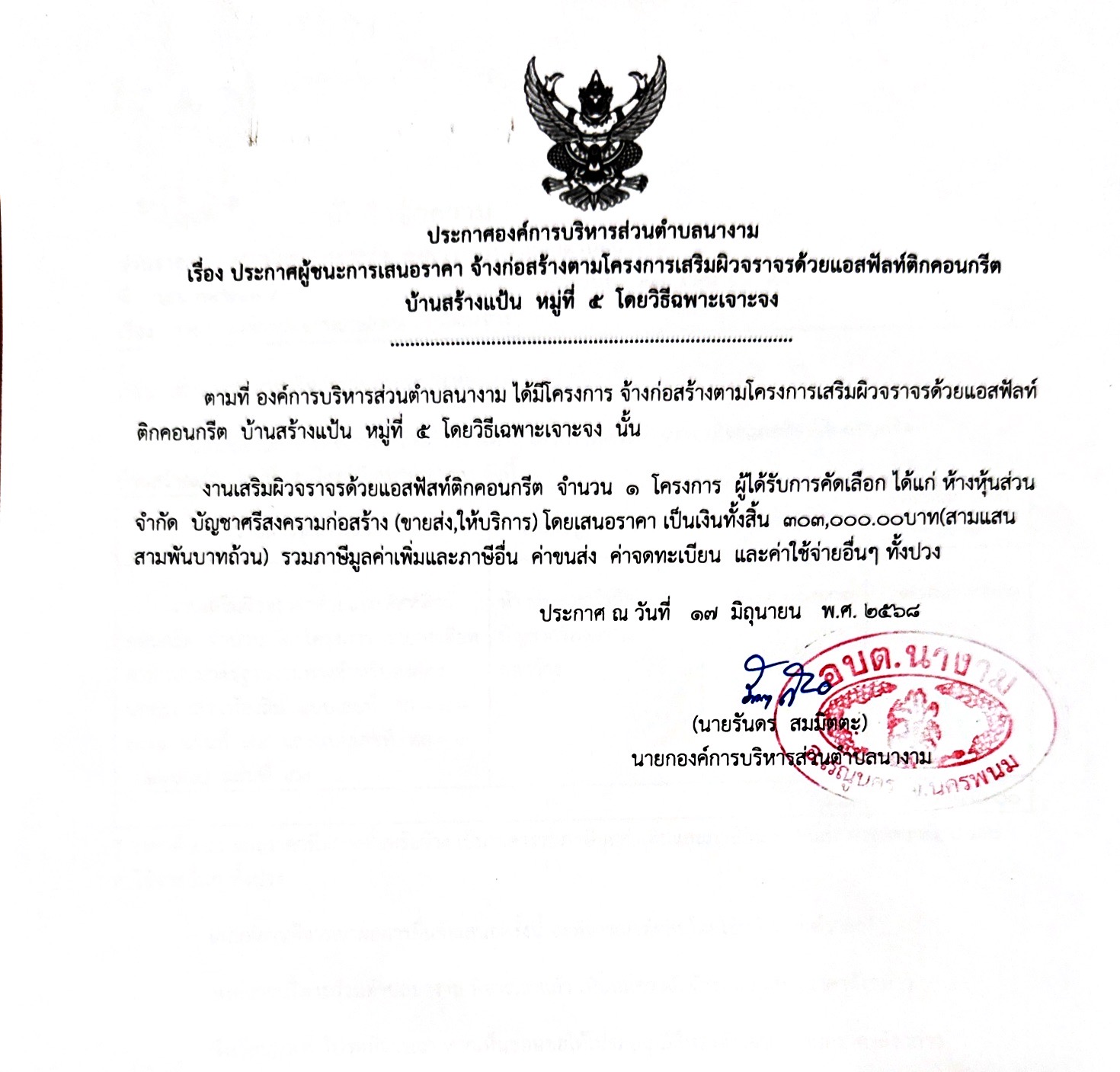 ชื่อเรื่อง : ประกาศผู้ชนะการเสนอราคา จ้างตามโครงการเสริมผิว จราจรด้วยแอสฟัลท์ติกคอนกรีต บ้านสร้างแป้น หมู่ที่ 5 โดยวิธีเฉพาะเจาะจง