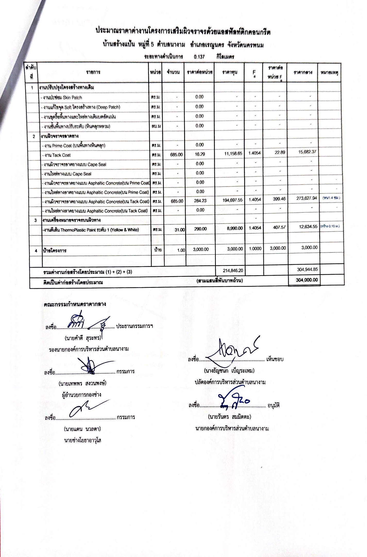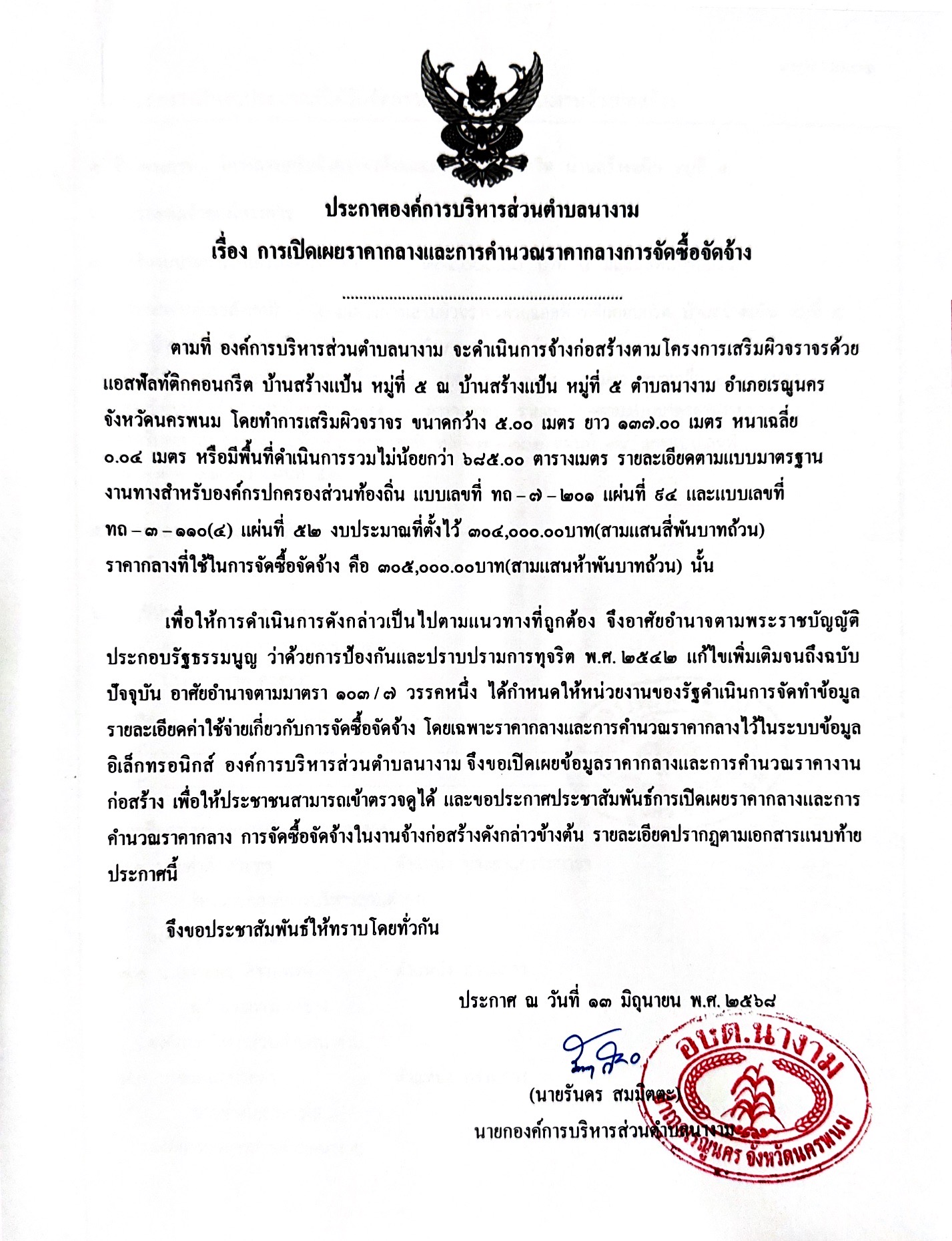 ประชาสัมพันธ์การเปิดเผยราคากลาง จ้างตามโครงการเสริมผิวจราจรด้วยแอสฟัลท์ติกคอนกรีต บ้านสร้างแป้น หมู่ที่ 5
