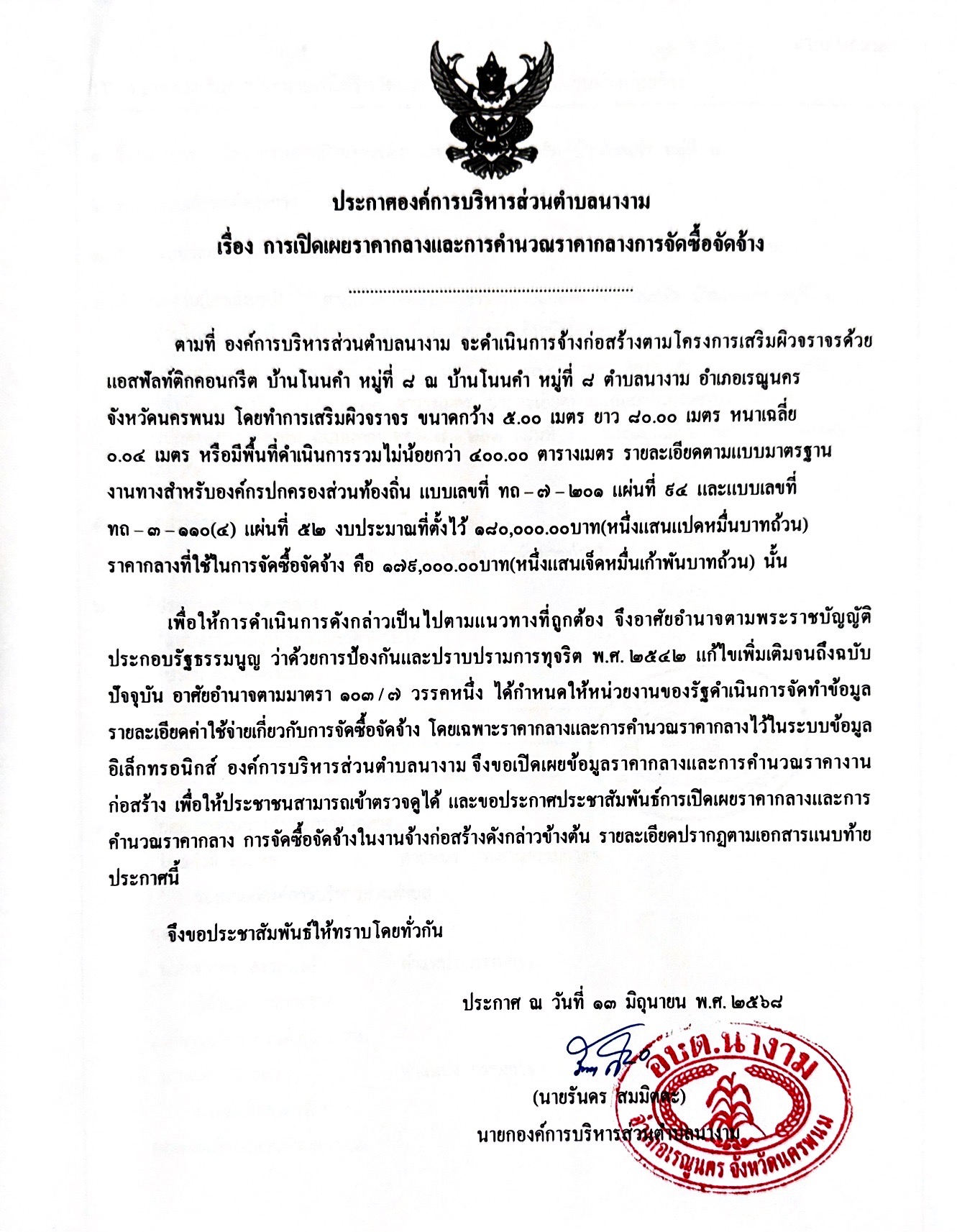 ชื่อเรื่อง : ประชาสัมพันธ์การเปิดเผยราคากลาง จ้างตามโครงการเสริมผิวจราจรด้วยแอสฟัลท์ติกคอนกรีต บ้านโนนคำ หมู่ที่ 8