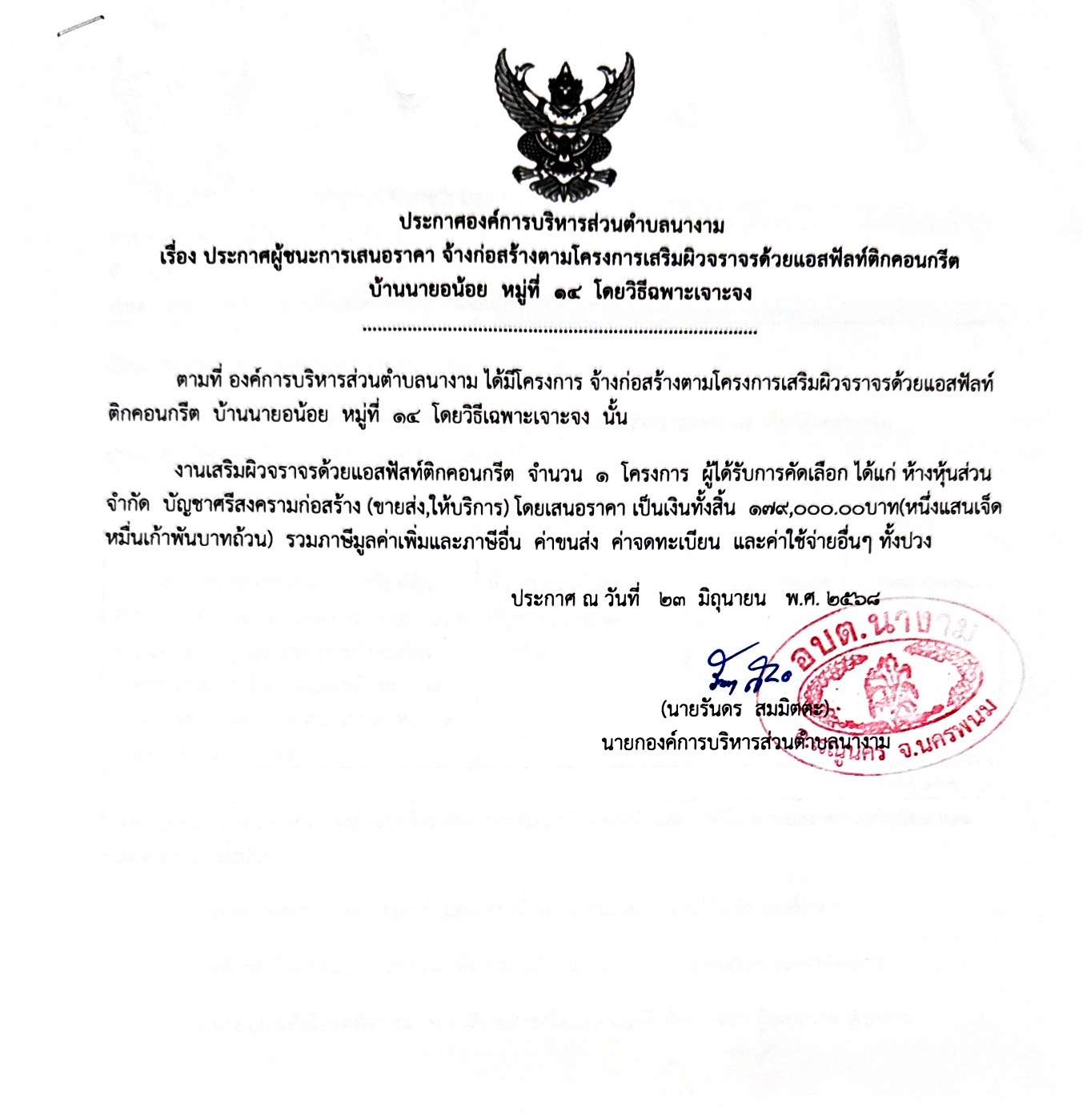 ประกาศผู้ชนะการเสนอราคา จ้างก่อสร้างตามโครงการเสริมผิวจราจรด้วยแอสฟัลท์ บ้านนายอน้อย หมู่ที่ 14 โดยวิธีเฉพาะเจาะจง