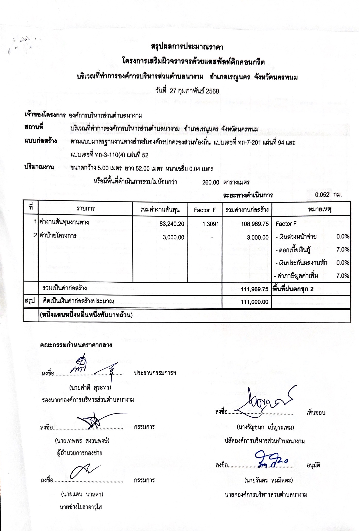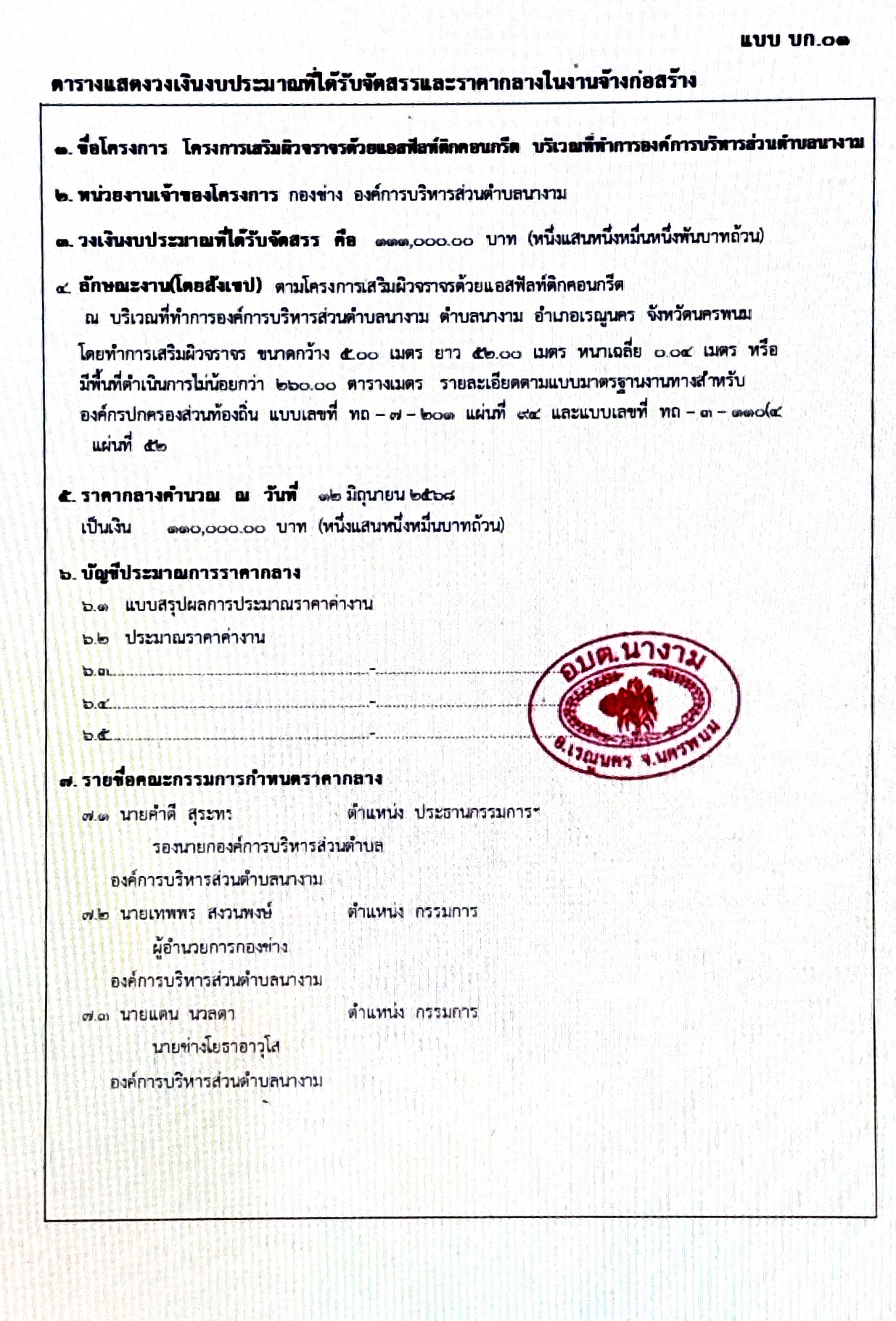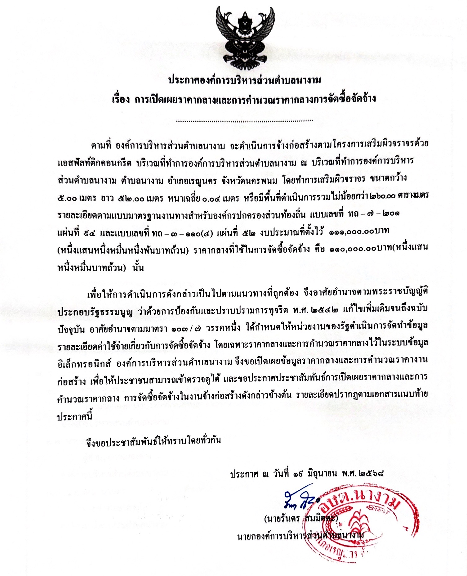 ประชาสัมพันธ์การเปิดเผยราคากลาง จ้างตามโครงการเสริมผิวจราจรด้วยแอสฟัลท์ติกคอนกรีต บริเวณที่ทำการองค์การบริหารส่วนตำบลนางาม โดยวิธีเฉพาะเจาะจง