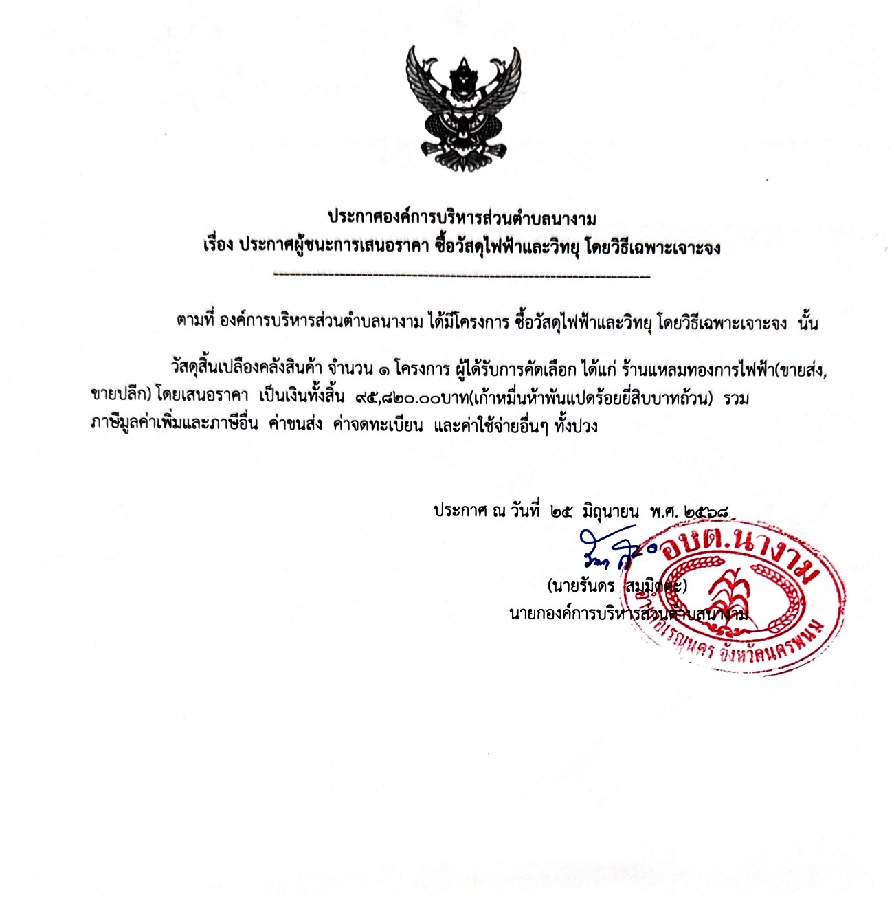 ชื่อเรื่อง : ประกาศผู้ชนะการเสนอราคา ซื้อวัสดุไฟฟ้าและวิทยุ โดยวิธีเฉพาะเจาะจง
