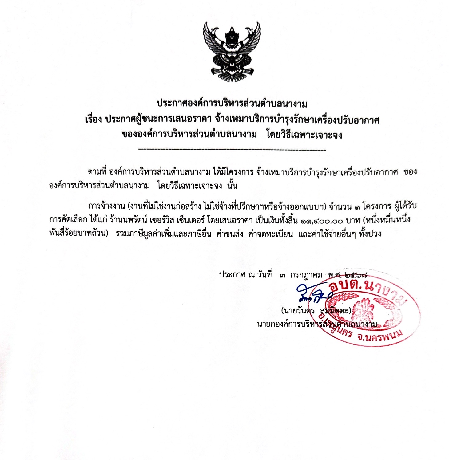 ประกาศผู้ชนะการเสนอราคา จ้างเหมาบริการบำรุงรักษาเครื่องปรับอากาศ ขององค์การบริหารส่วนตำบลนางาม โดยวิธีเฉพาะเจาะจง