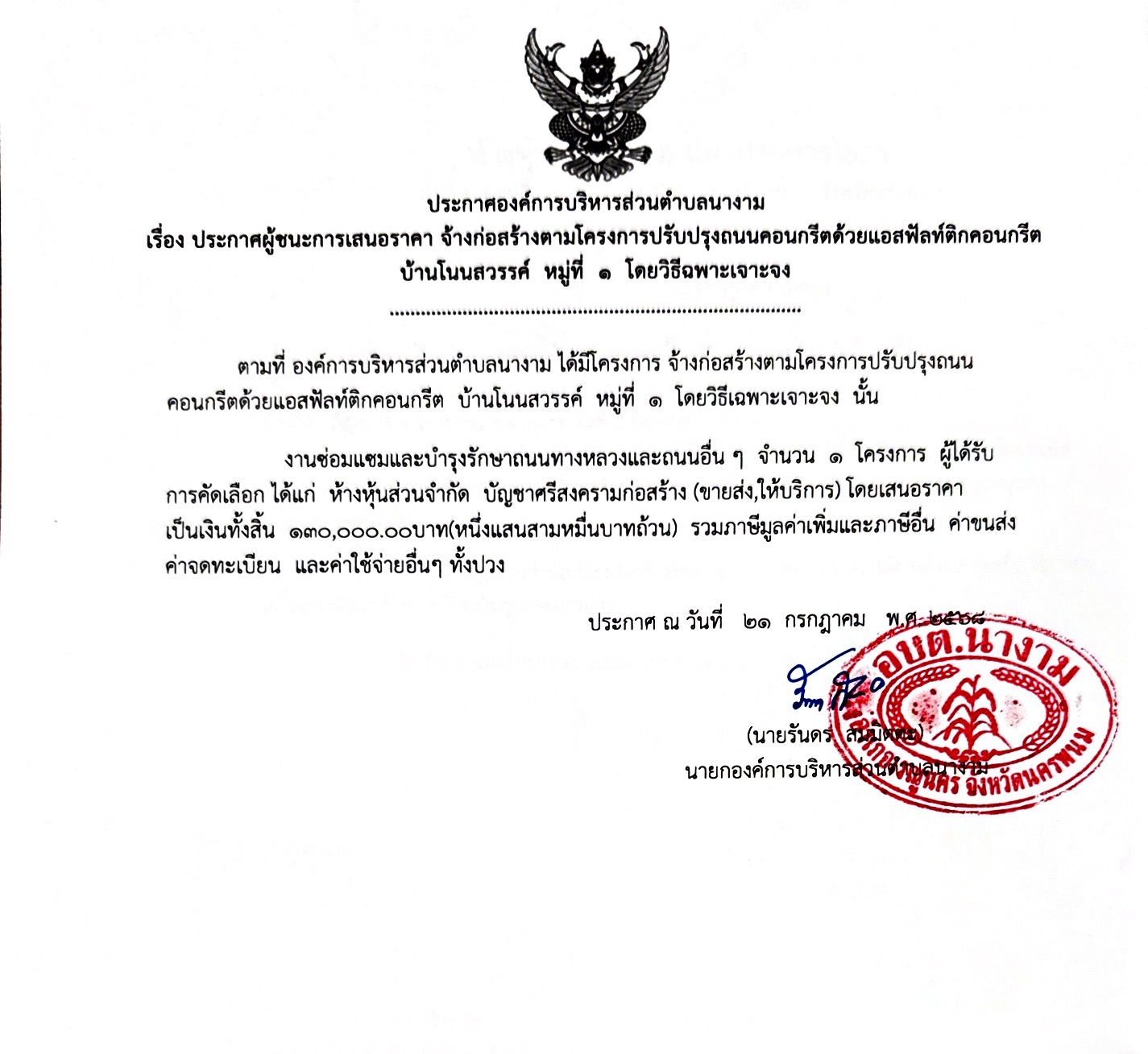 ชื่อเรื่อง : ประกาศผู้ชนะการเสนอราคา จ้างก่อสร้างตามโครงการปรับปรุงถนนคอนกรีตด้วยแอสฟัลท์ติกคอนกรีต บ้านโนนสวรรค์ หมู่ที่ 1 โดยวิธีเฉพาะเจาะจง