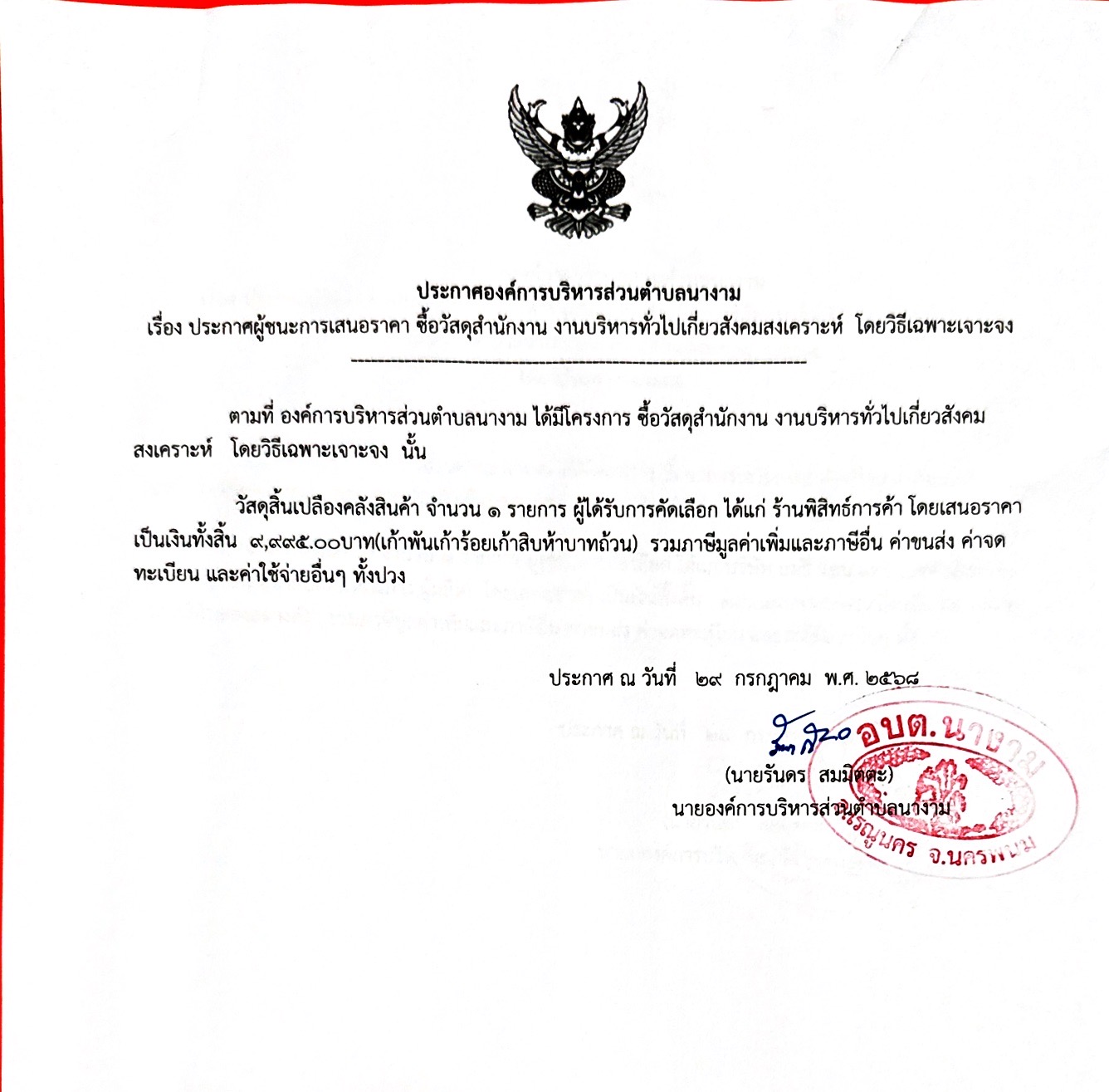 ประกาศผู้ชนะการเสนอราคา ซื้อวัสดุสำนักงาน งานบริหารทั่วไปเกี่ยวกับสังคมสงเคราะห์ โดยวิธีเฉพาะเจาะจง