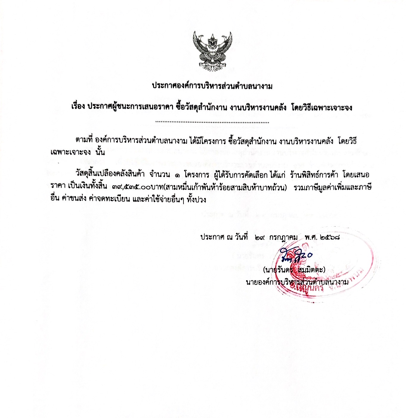 ประกาศผู้ชนะการเสนอราคา ซื้อวัสดุสำนักงาน งานบริหารงานคลัง โดยวิธีเฉพาะเจาะจง