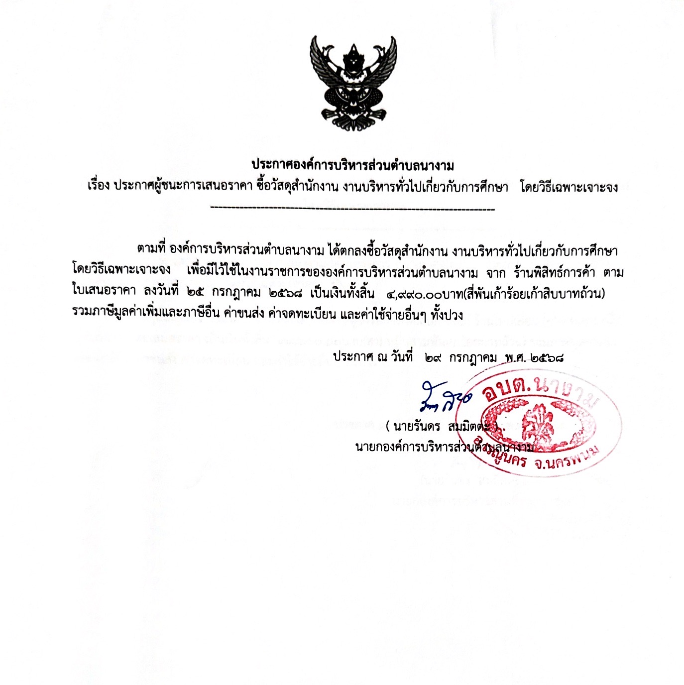 ประกาศผู้ชนะการเสนอราคา ซื้อวัสดุสำนักงาน งานบริหารทั่วไปเกี่ยวกับการศึกษา โดยวิธีเฉพาะเจาะจง