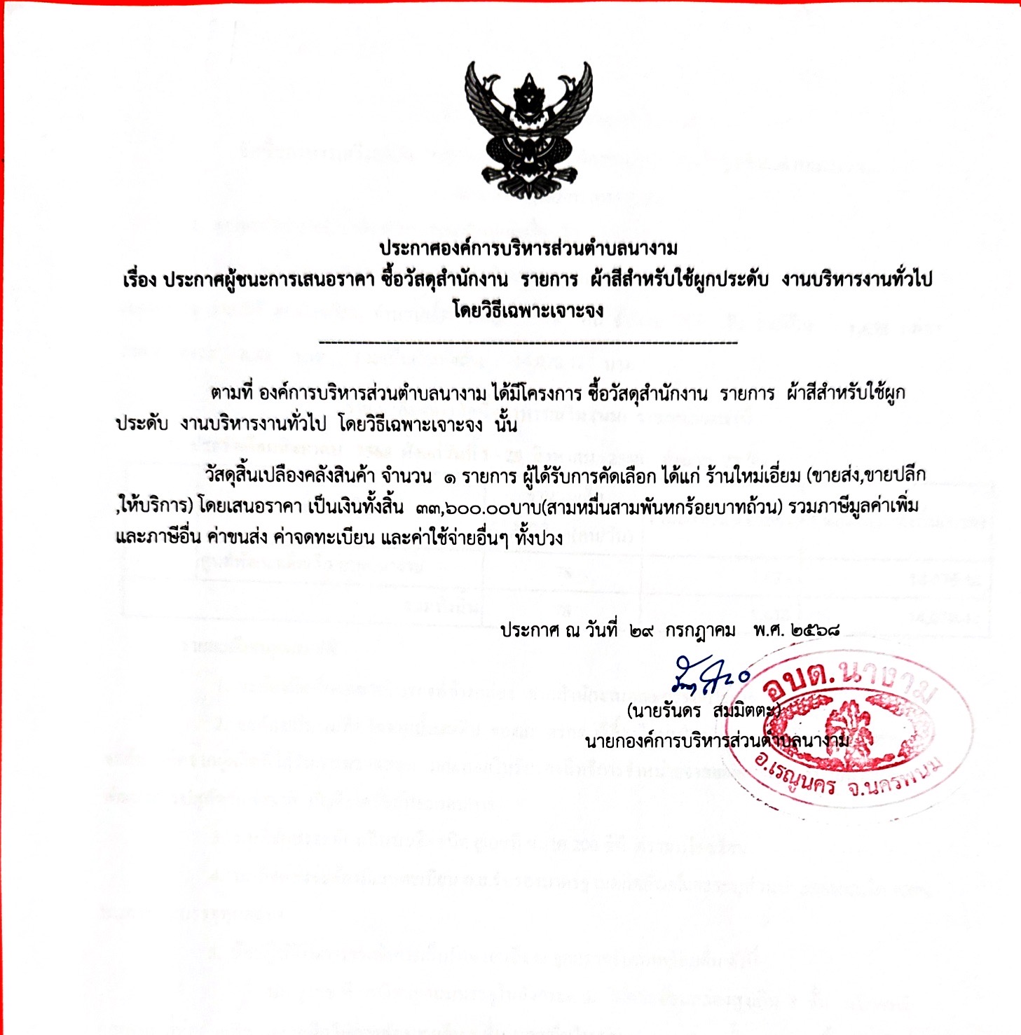 ประกาศผู้ชนะการเสนอราคา ซื้อวัสดุสำนักงาน รายการ ผ้าสีสำหรับใช้ผูกประดับ งานบริหารงานทั่วไป โดยวิธีเฉพาะเจาะจง
