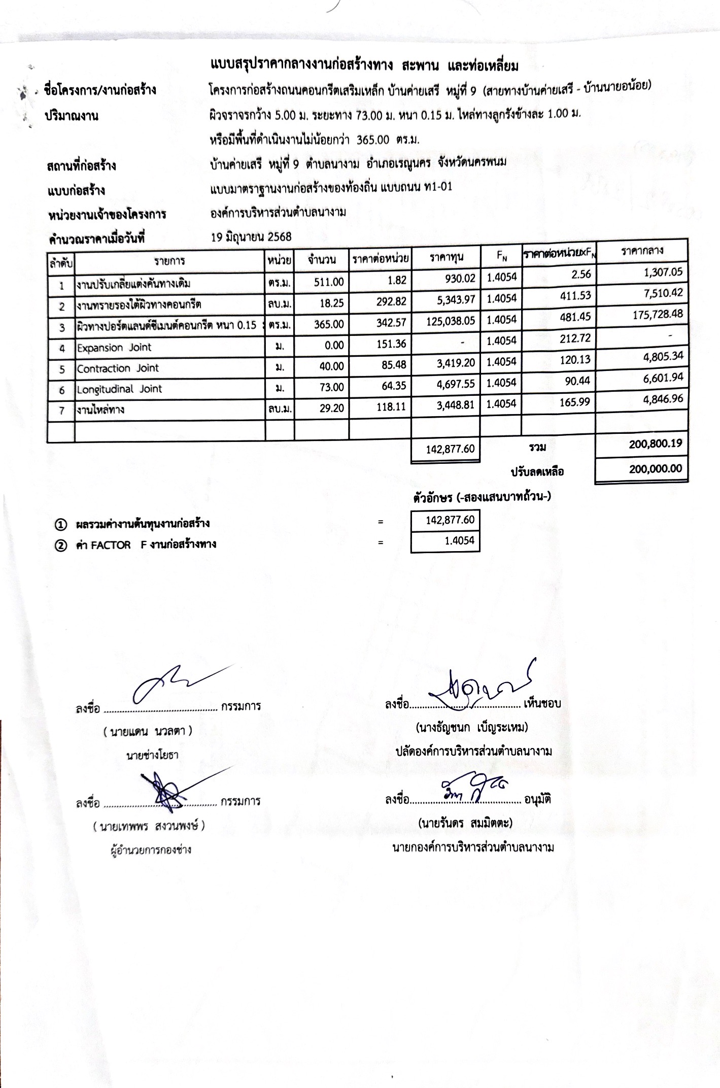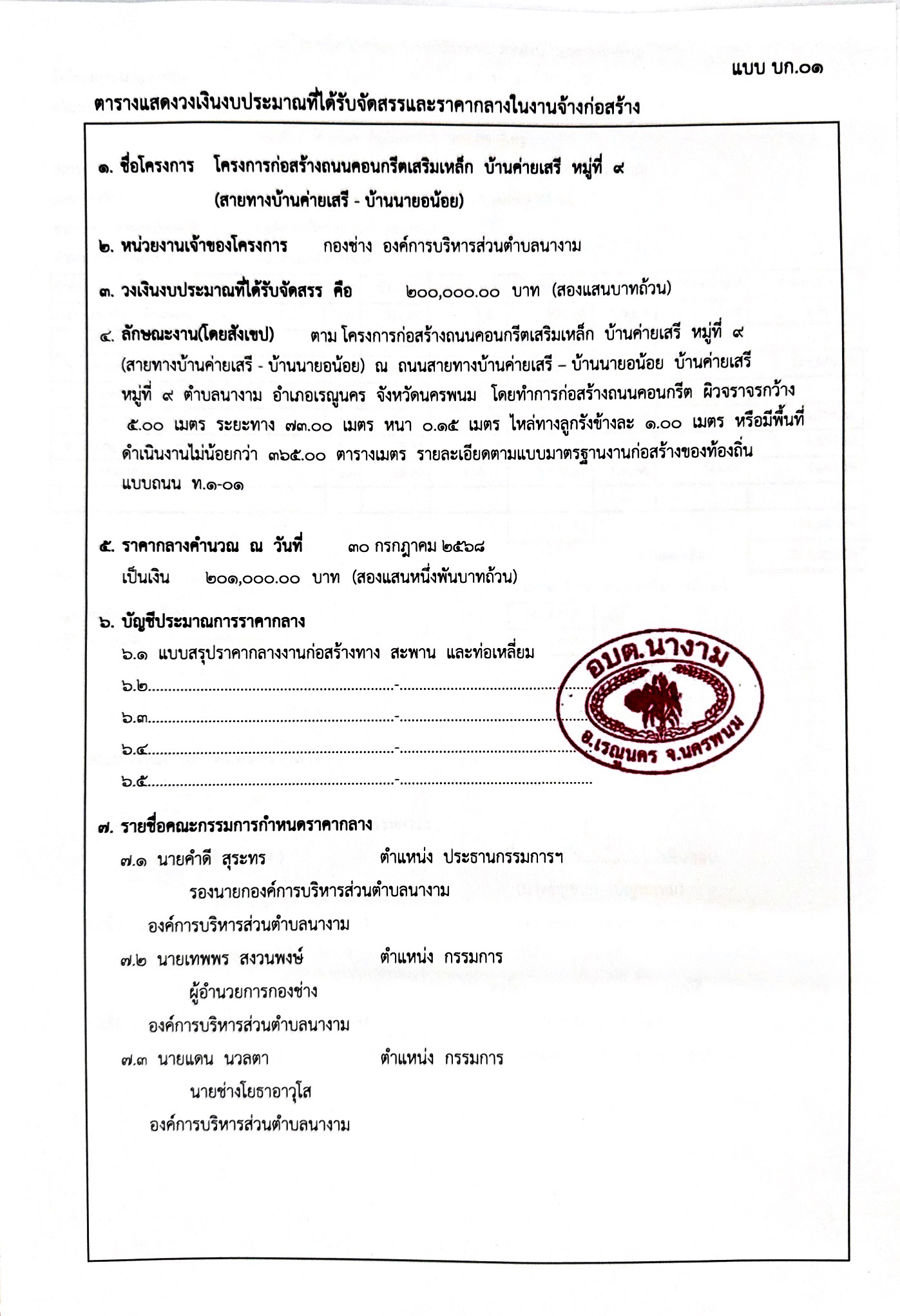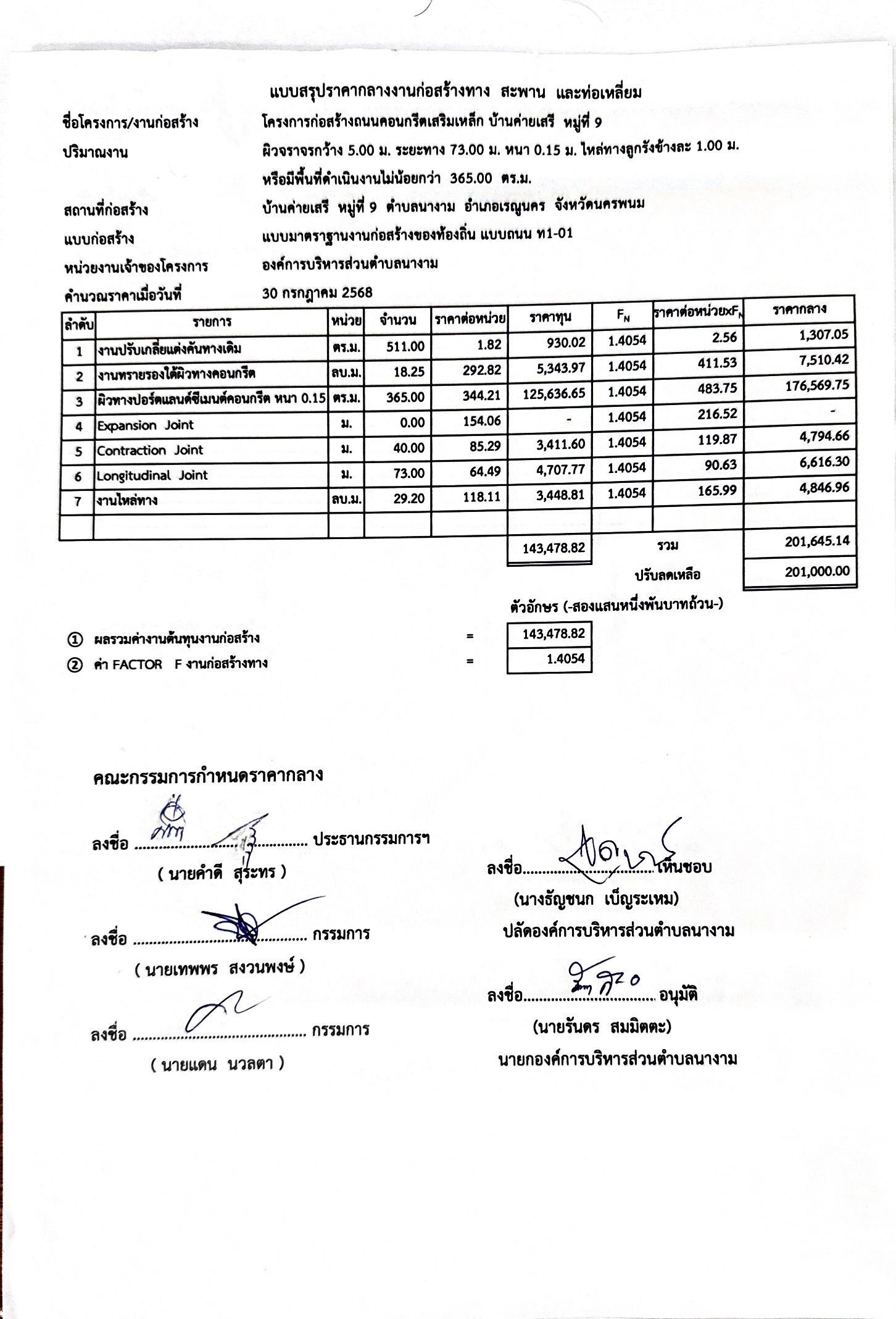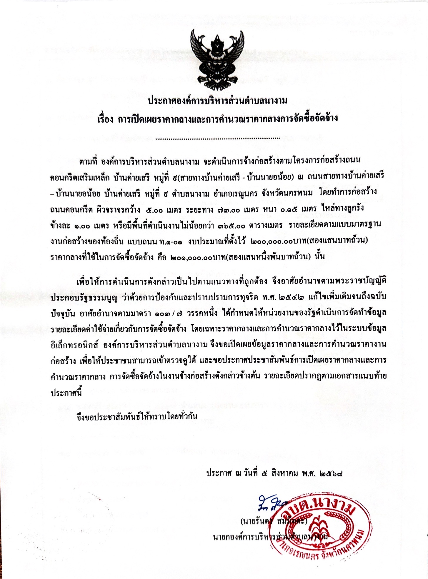 ประชาสัมพันธ์การเปิดเผยราคากลาง จ้างตามโครงการก่อสร้างถนนคอนกรีตเสริมเหล็ก บ้านค่ายเสรี หมู่ที่ 9(สายทางบ้านค่ายเสรี - บ้านนายอน้อย) โดยวิธีเฉพาะเจาะจง