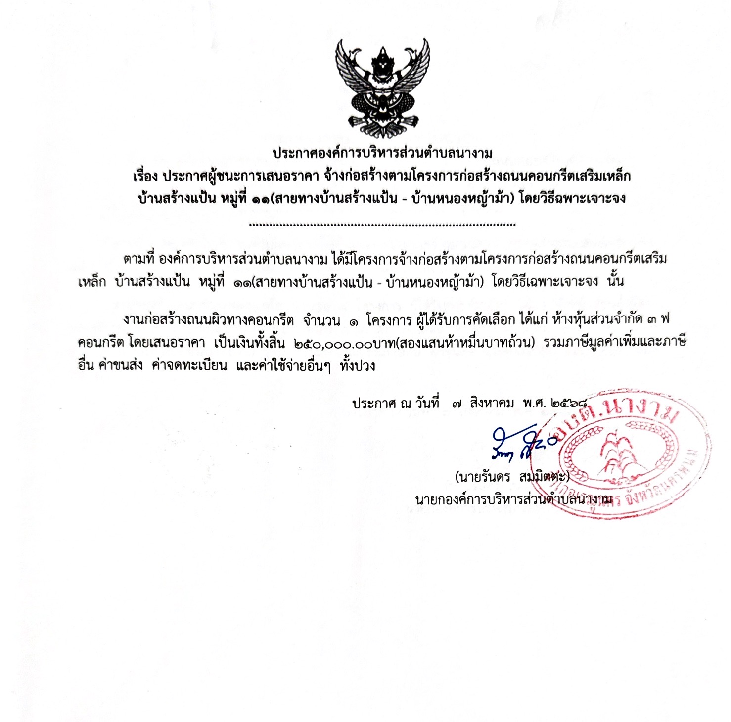 ประกาศผู้ชนะการเสนอราคา จ้างตามโครงการก่อสร้างถนนคอนกรีตเสริมเหล็ก บ้านสร้างแป้น หมู่ที่ 11(สายทางบ้านสร้างแป้น - บ้านหนองหญ้าม้า) โดยวิธีเฉพาะเจาะจง