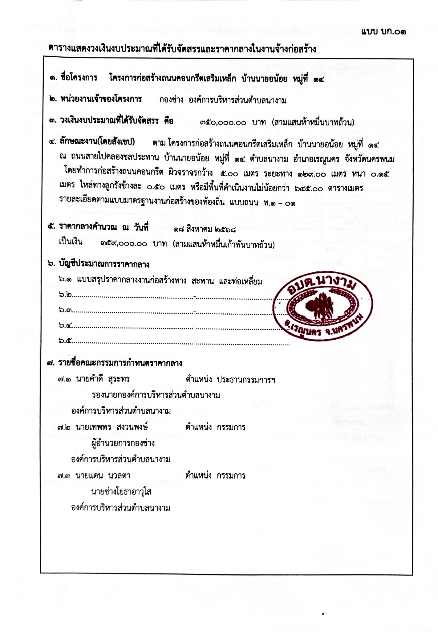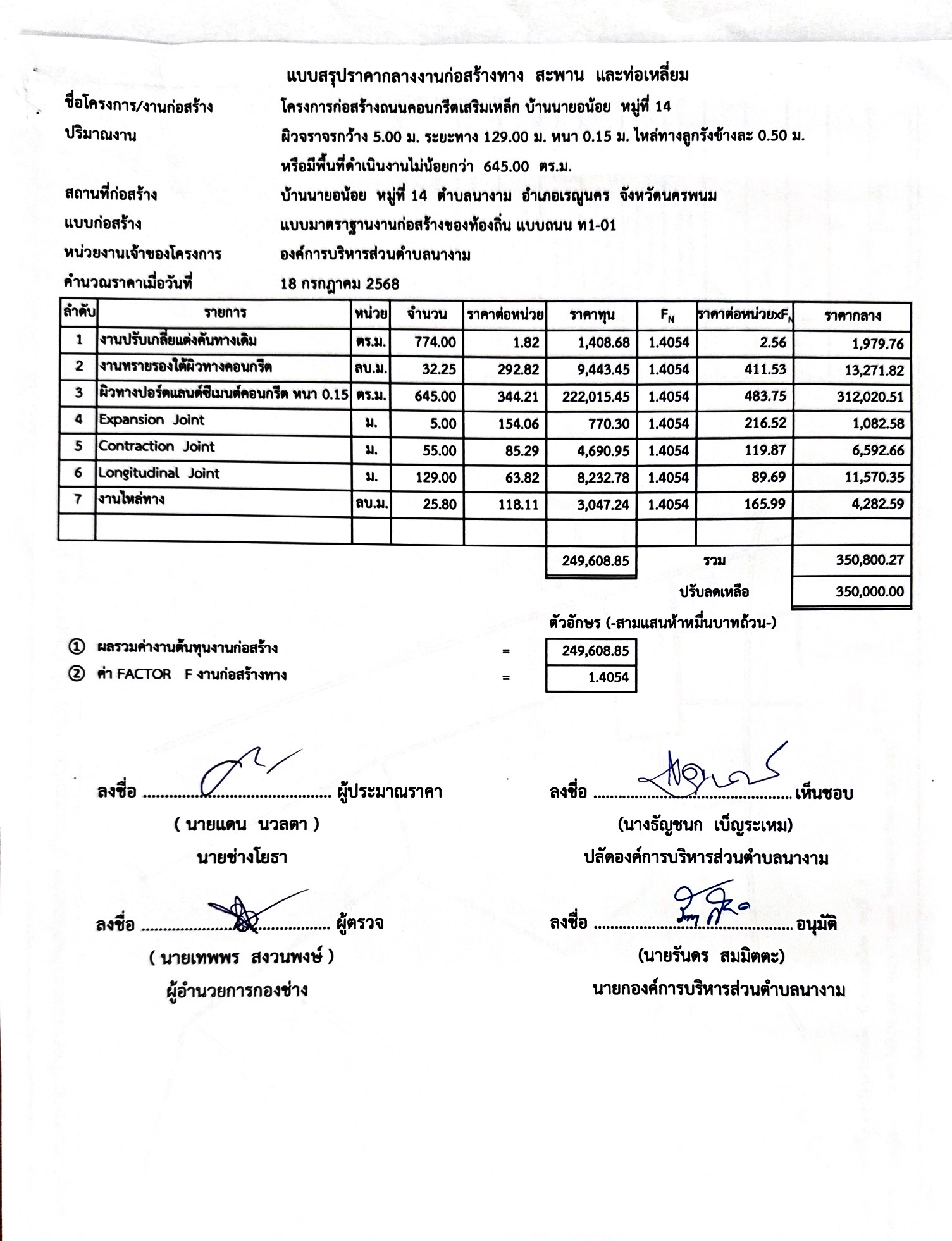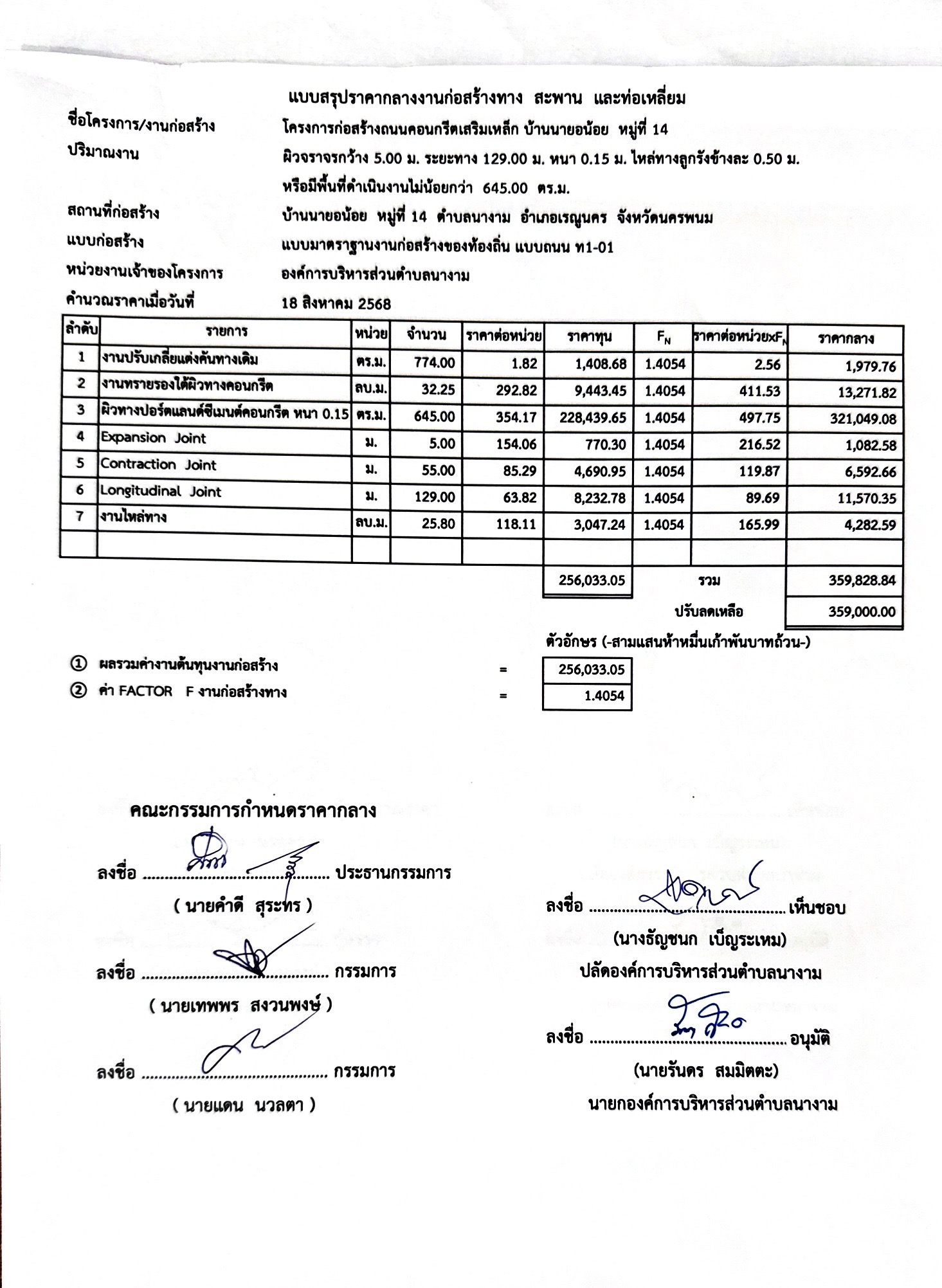ประชาสัมพันธ์การเปิดเผยราคากลาง จ้างตามโครงการก่อสร้างถนนคอนกรีตเสริมเหล็ก บ้านนายอน้อย หมู่ที่ 14 โดยวิธีเฉพาะเจาะจง