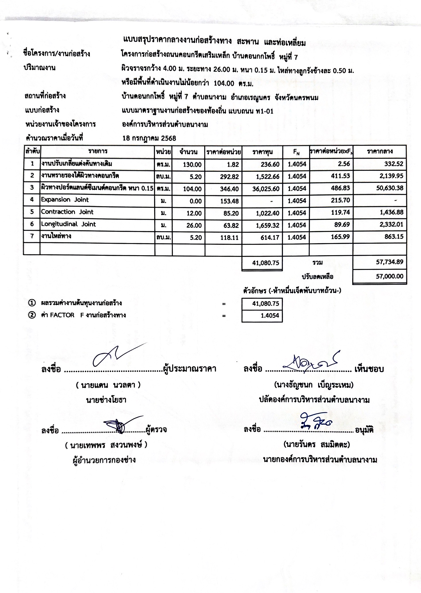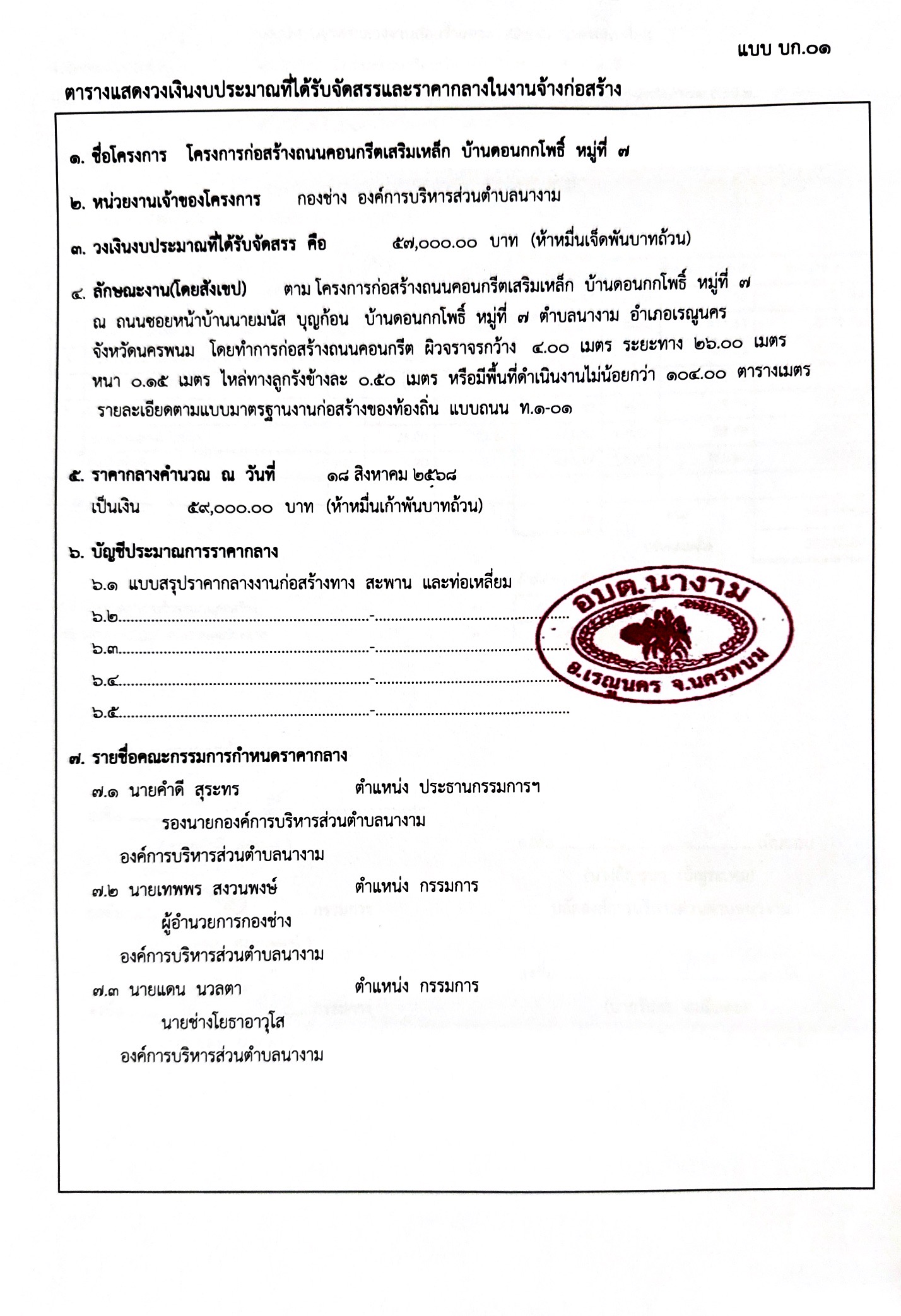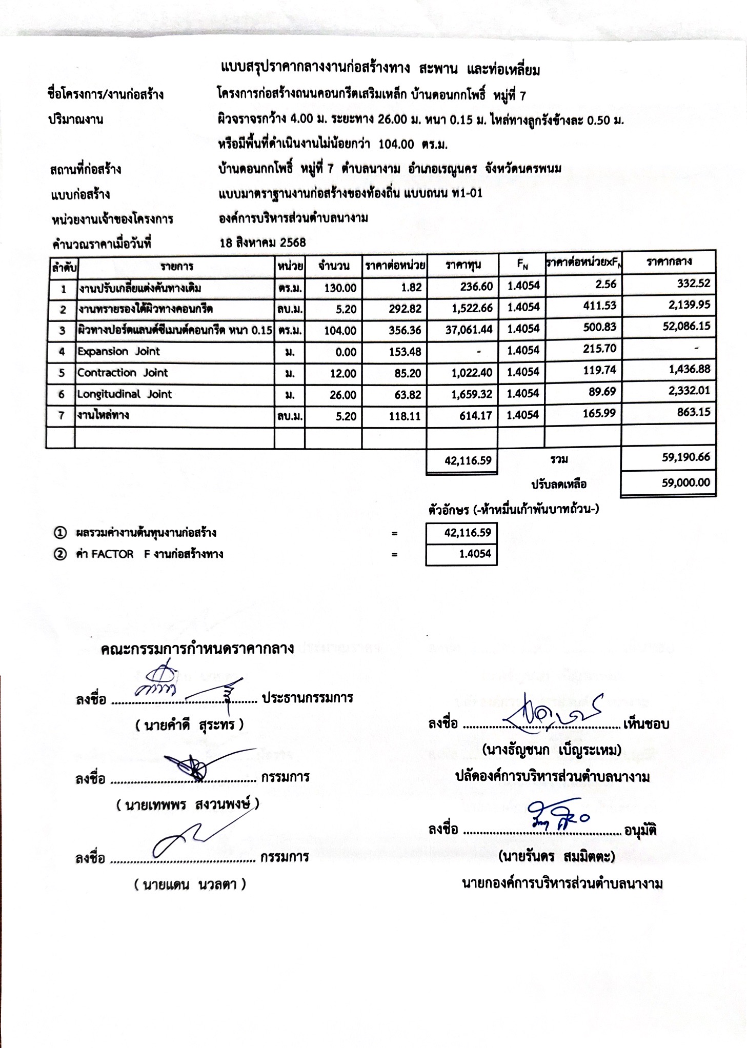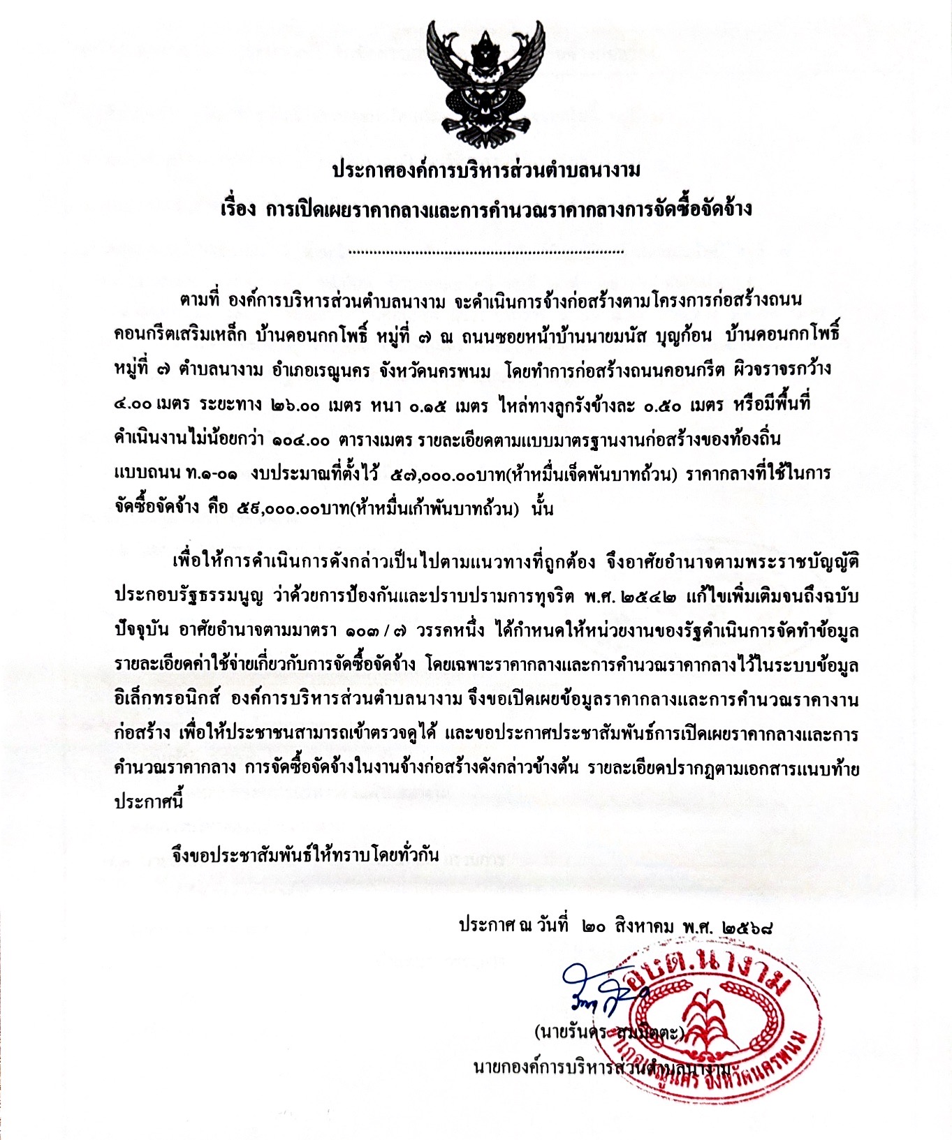 ประชาสัมพันธ์การเปิดเผยราคากลาง จ้างตามโครงการก่อสร้างถนนคอนกรีตเสริมเหล็ก บ้านดอนกกโพธิ์ หมู่ที่ 7 โดยวิธีเฉพาะเจาะจง