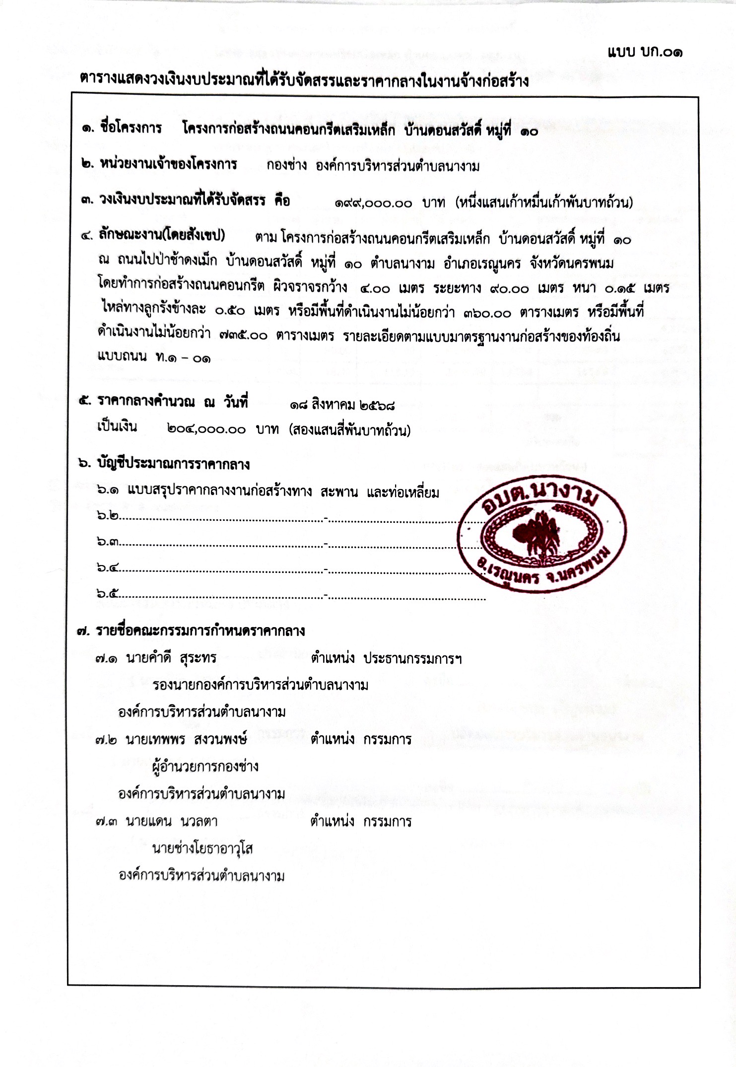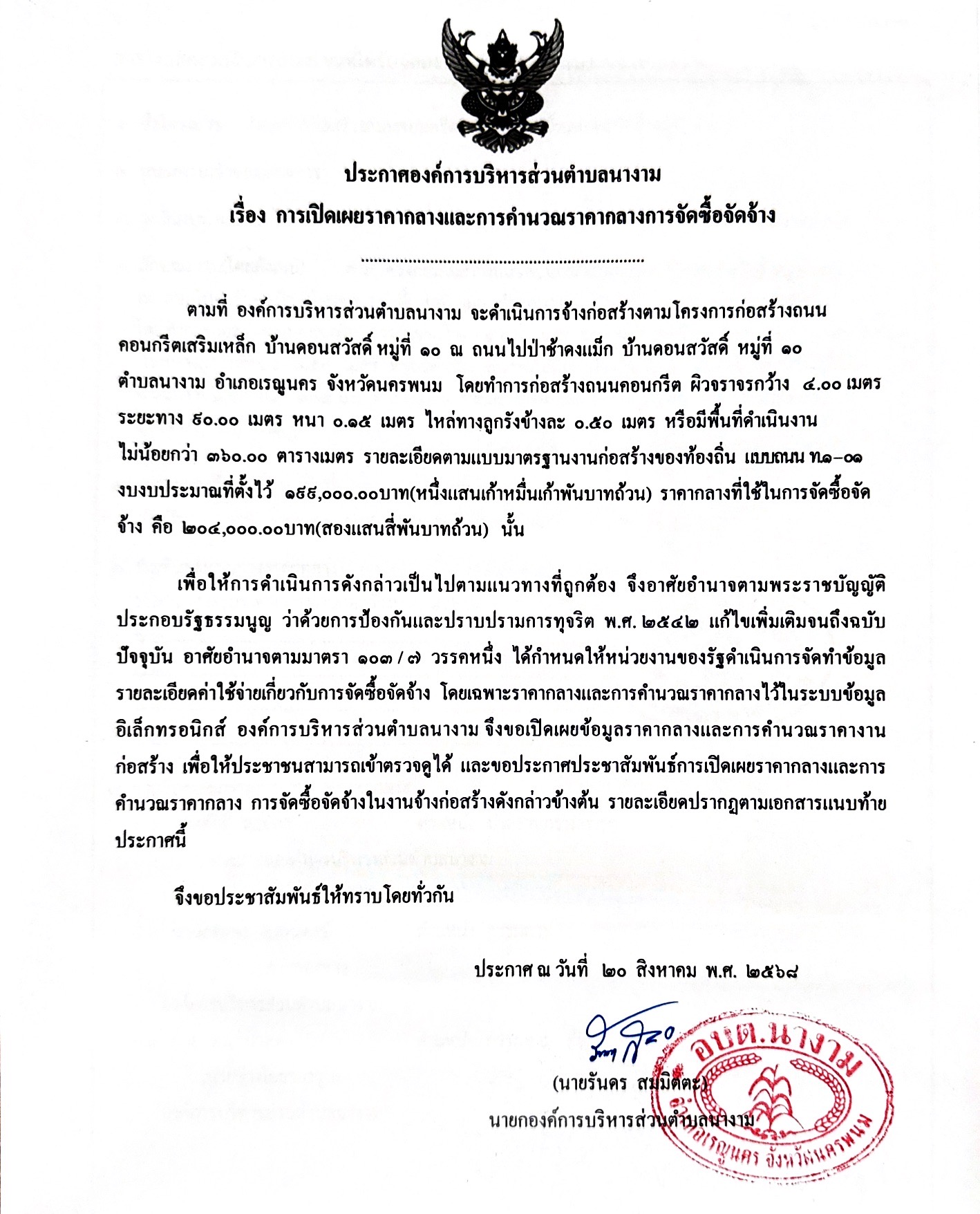 ประชาสัมพันธ์การเปิดเผยราคากลาง จ้างตามโครงการก่อสร้างถนนคอนกรีตเสริมเหล็ก บ้านดอนสวัสดิ์ หมู่ที่ 10 โดยวิธีเฉพาะเจาะจง