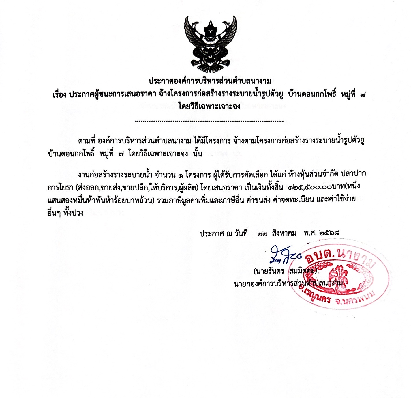 ประกาศผู้ชนะการเสนอราคา จ้างตามโครงการก่อสร้างรางระบายน้ำรูปตัวยู บ้านดอนกกโพธิ์ หมู่ที่ 7 โดยวิธีเฉพาะเจาะจง
