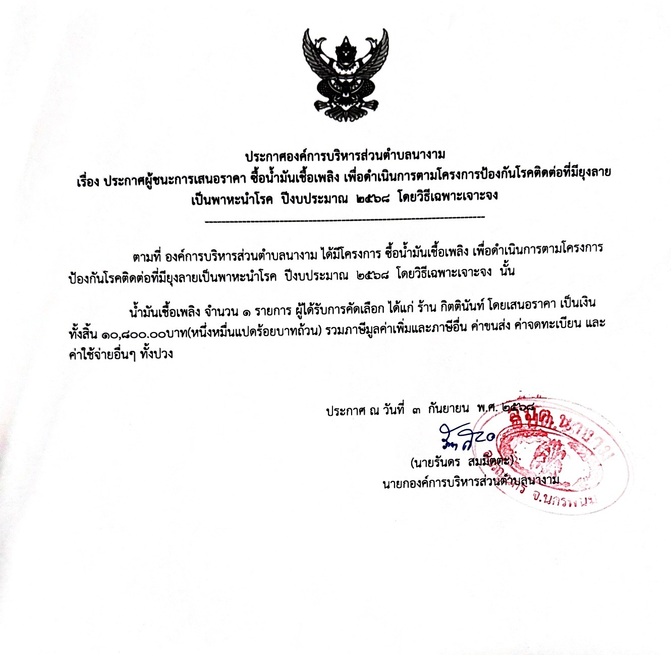 ประกาศผู้ชนะการเสนอราคา ซื้อน้ำมันเชื้อเพลิง เพื่อใช้ดำเนินการตามโครงการป้องกันโรคติดต่อที่มียุงลายเป็นพาหะนำโรค ปีงบประมาณ ๒๕๖๘ โดยวิธีเฉพาะเจาะจง